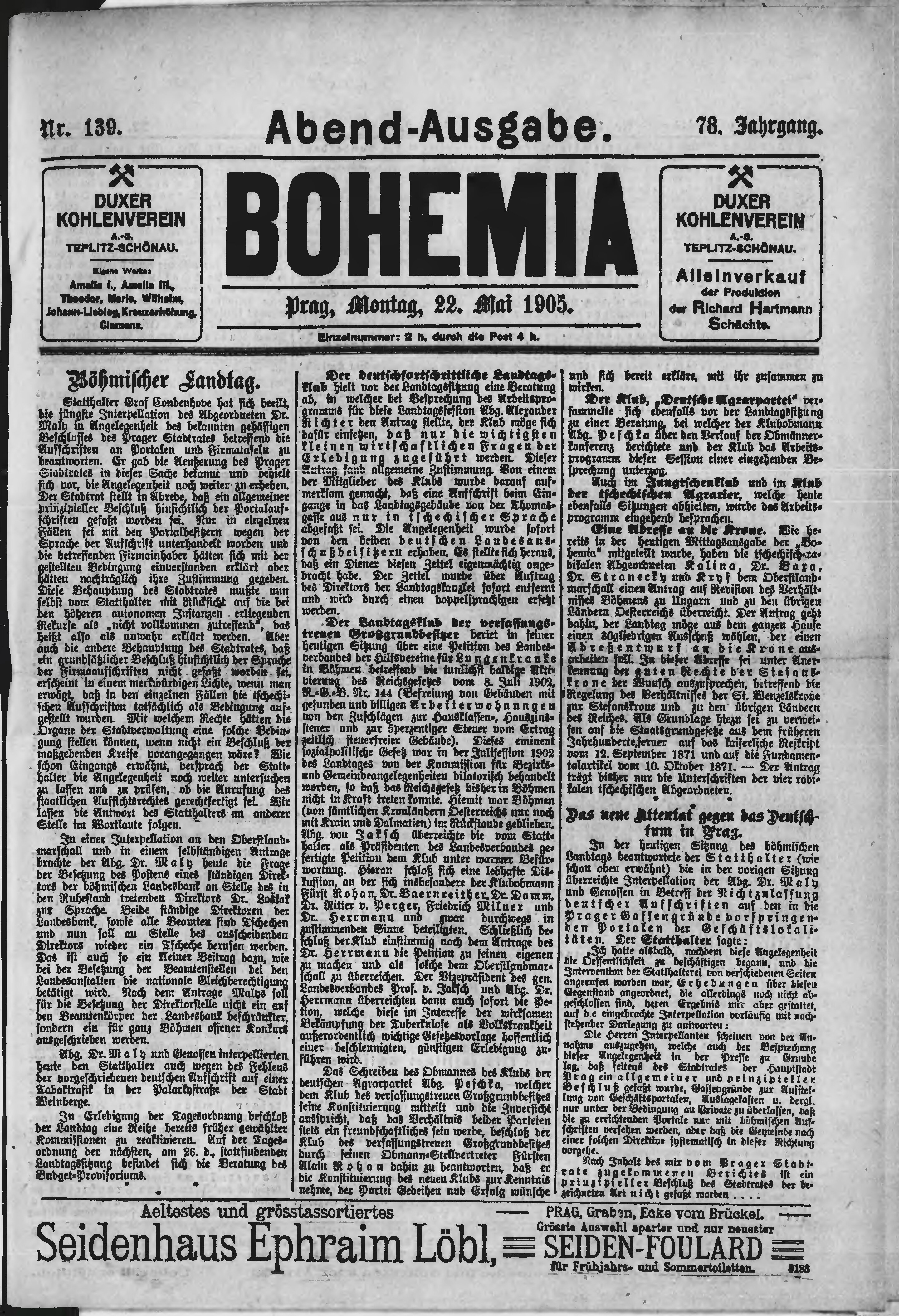 * Datum vydání výtisku: 22.5.1905 Číslo výtisku: 139 Poznámky k výtisku: večerní vydání;