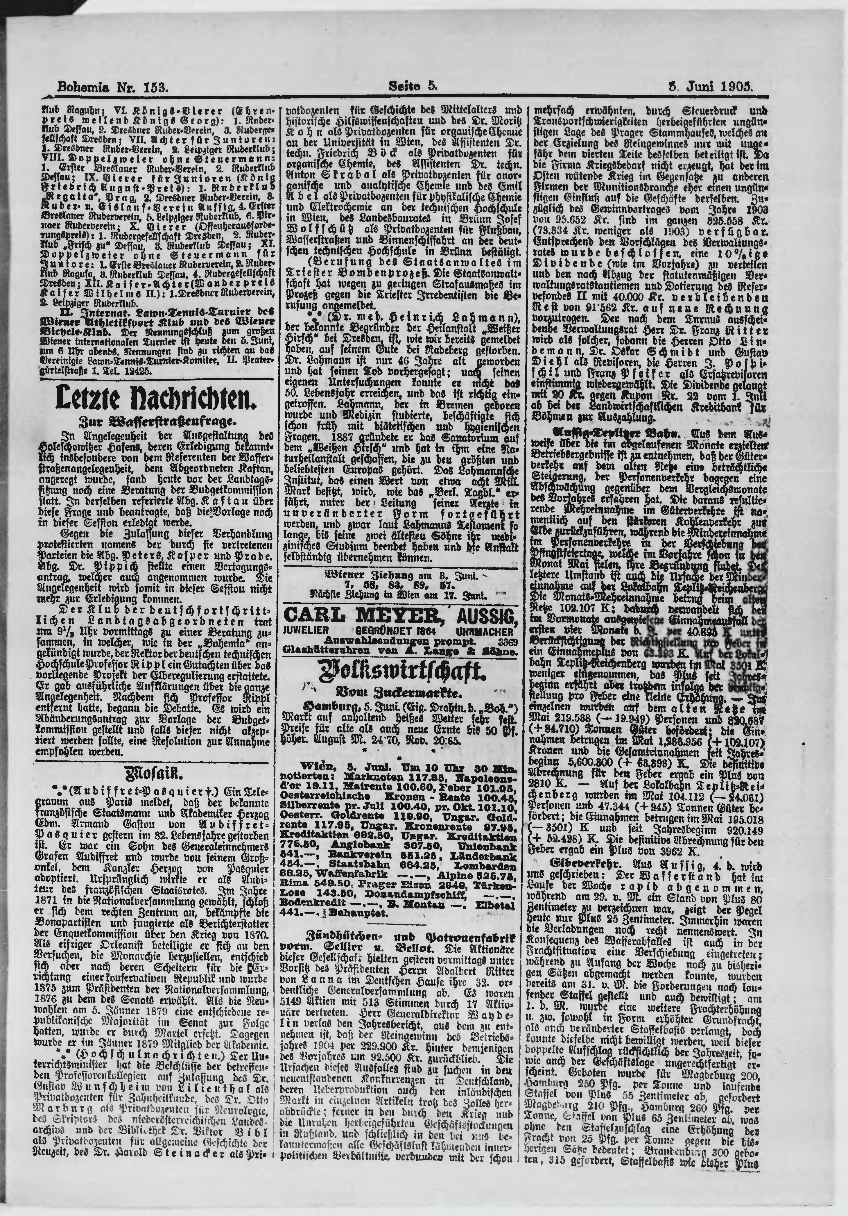 * Datum vydání výtisku: 5.6.1905 Číslo výtisku: 153 Poznámky k výtisku: polední vydání;