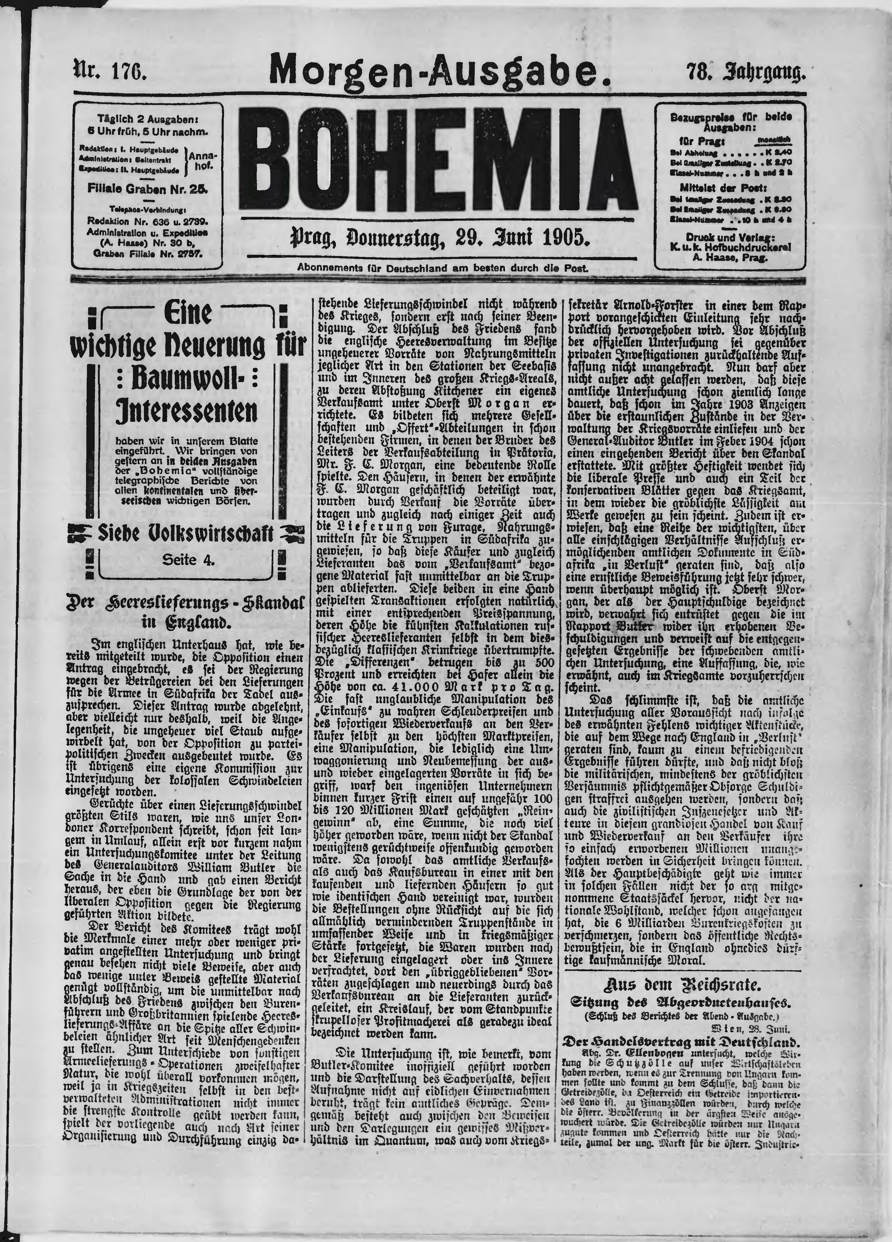* Datum vydání výtisku: 29.6.1905 Číslo výtisku: 176 Poznámky k výtisku: večerní vydání není k dispozici