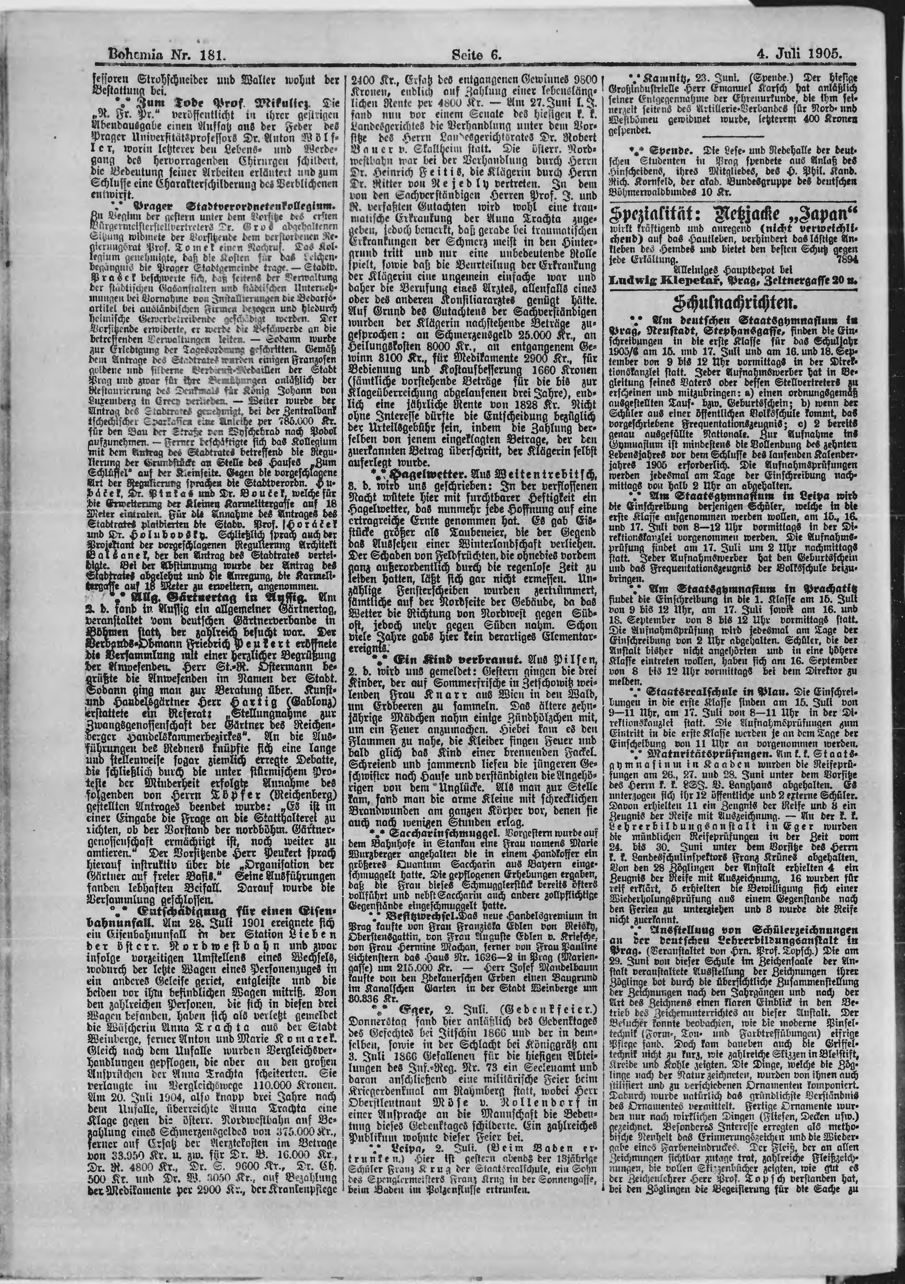 * Datum vydání výtisku: 4.7.1905 Číslo výtisku: 181 Poznámky k výtisku: ranní vydání;