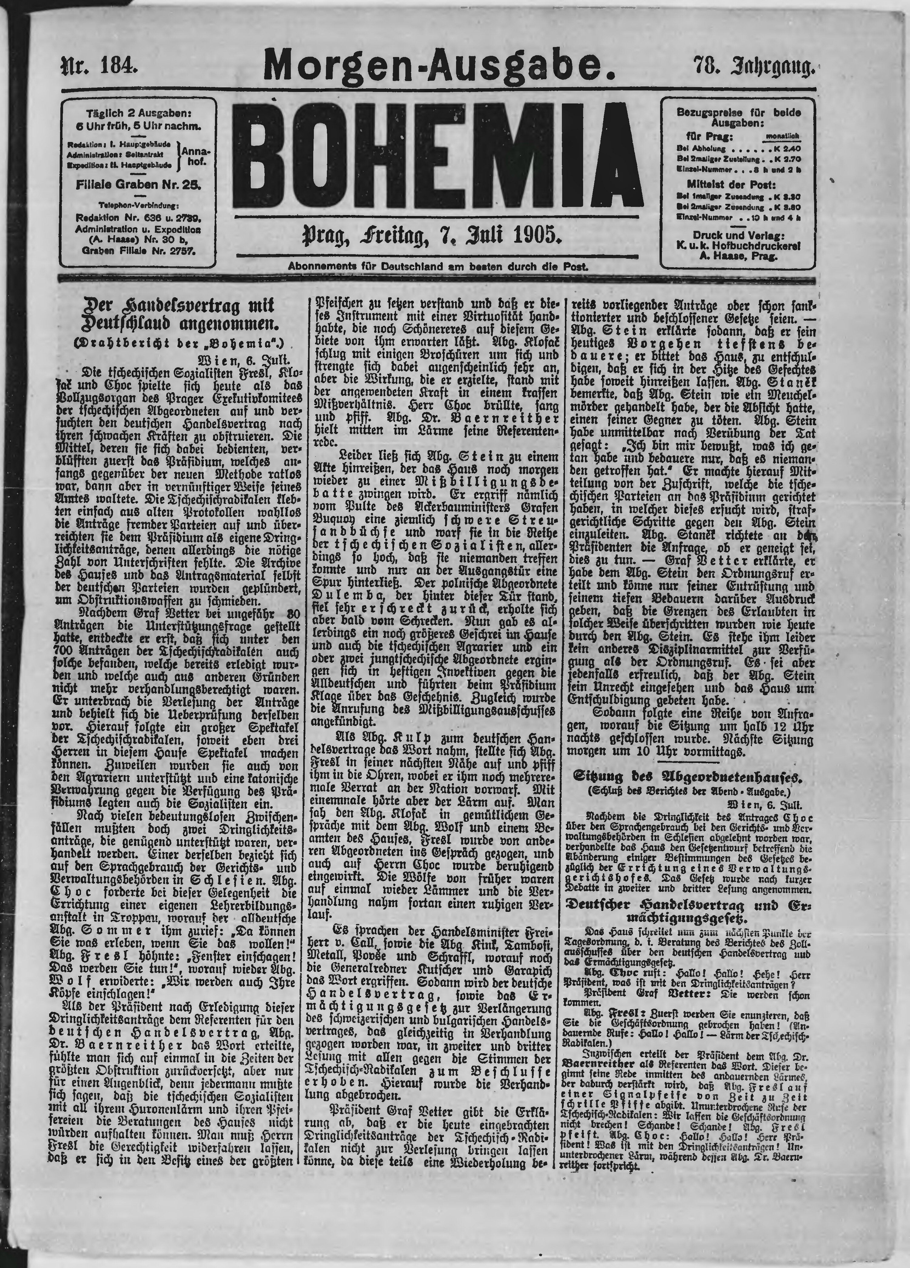 * Datum vydání výtisku: 7.7.1905 Číslo výtisku: 184 Poznámky k výtisku: ranní vydání;