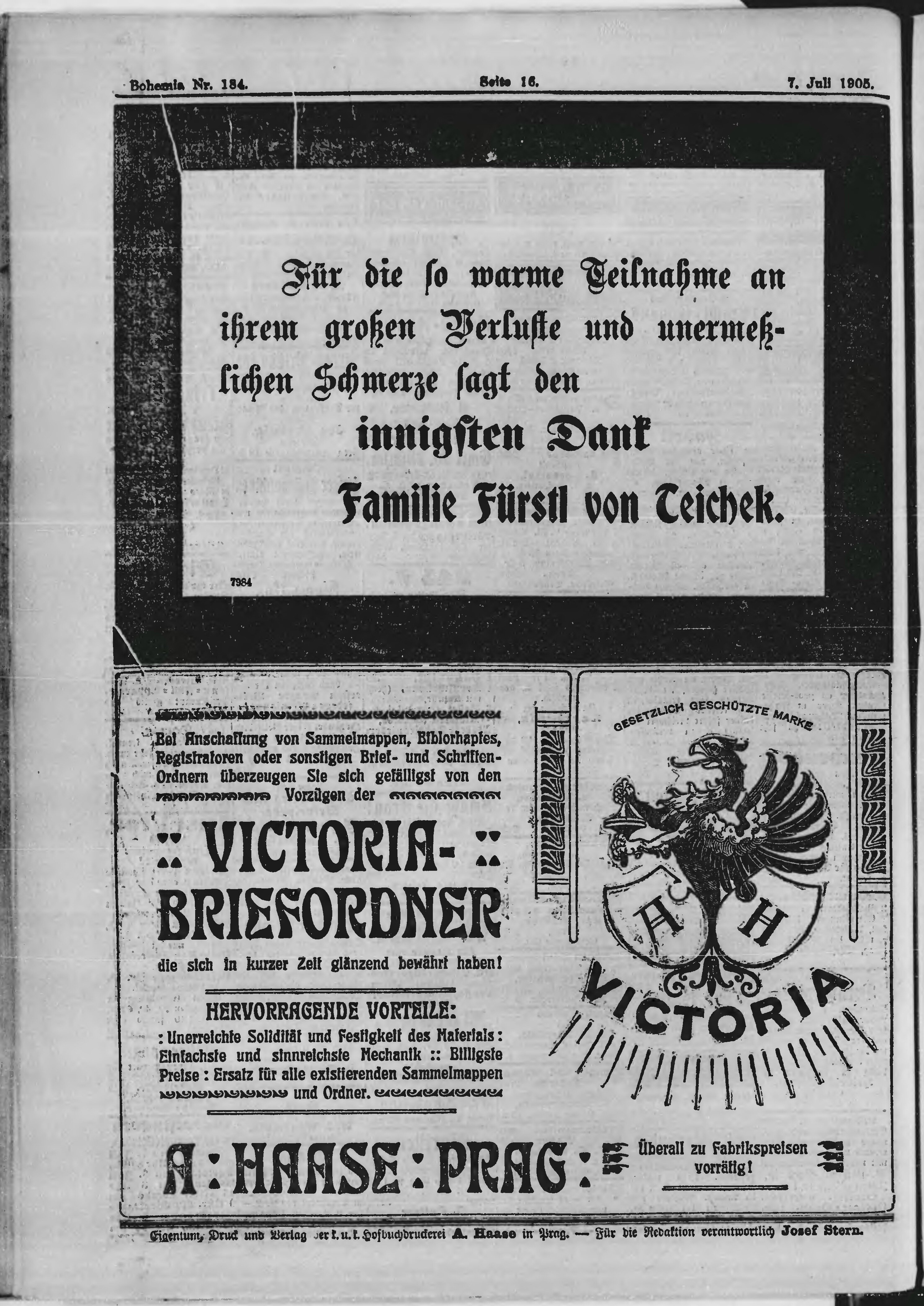 * Datum vydání výtisku: 7.7.1905 Číslo výtisku: 184 Poznámky k výtisku: ranní vydání;
