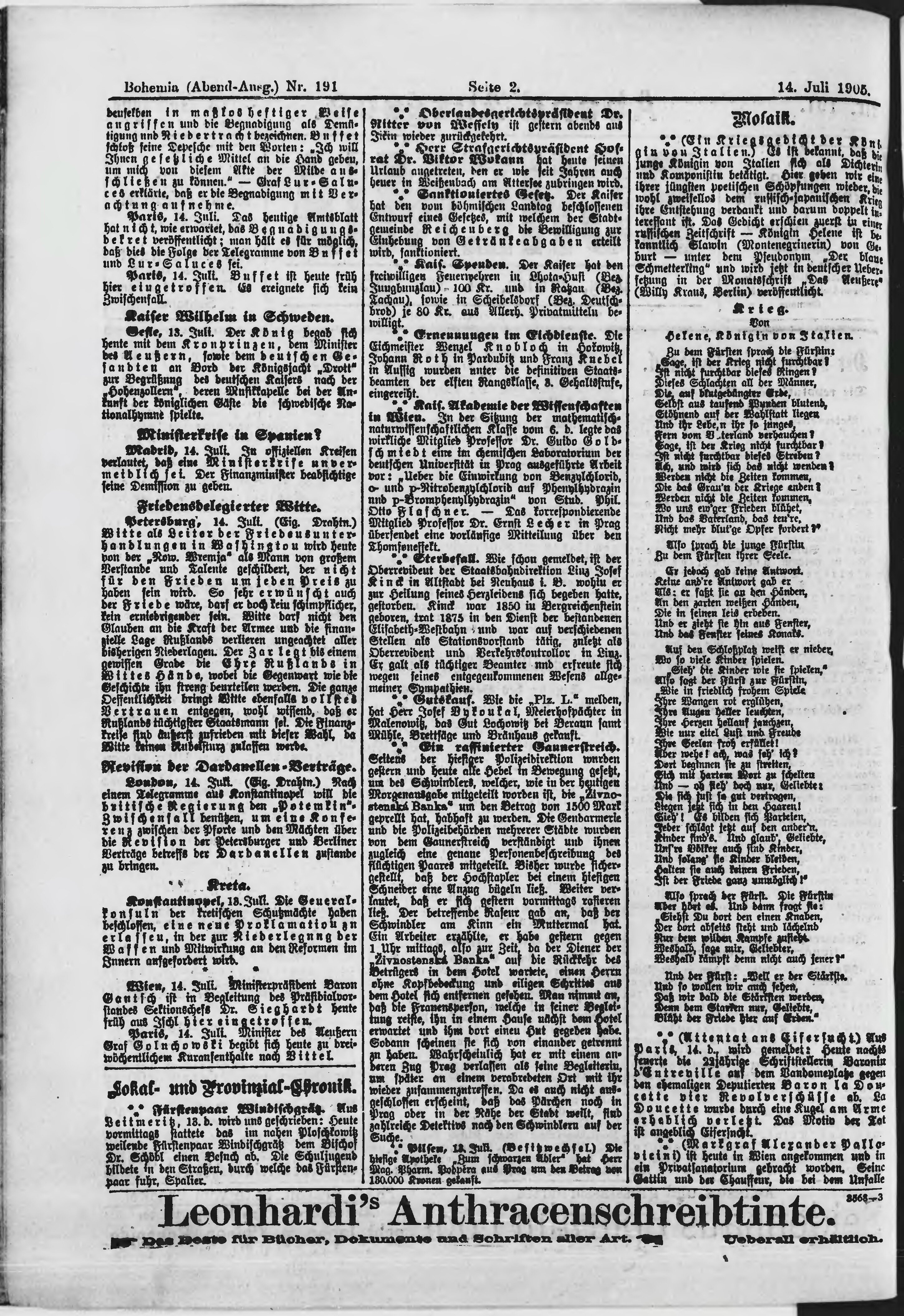 * Datum vydání výtisku: 14.7.1905 Číslo výtisku: 191 Poznámky k výtisku: večerní vydání;