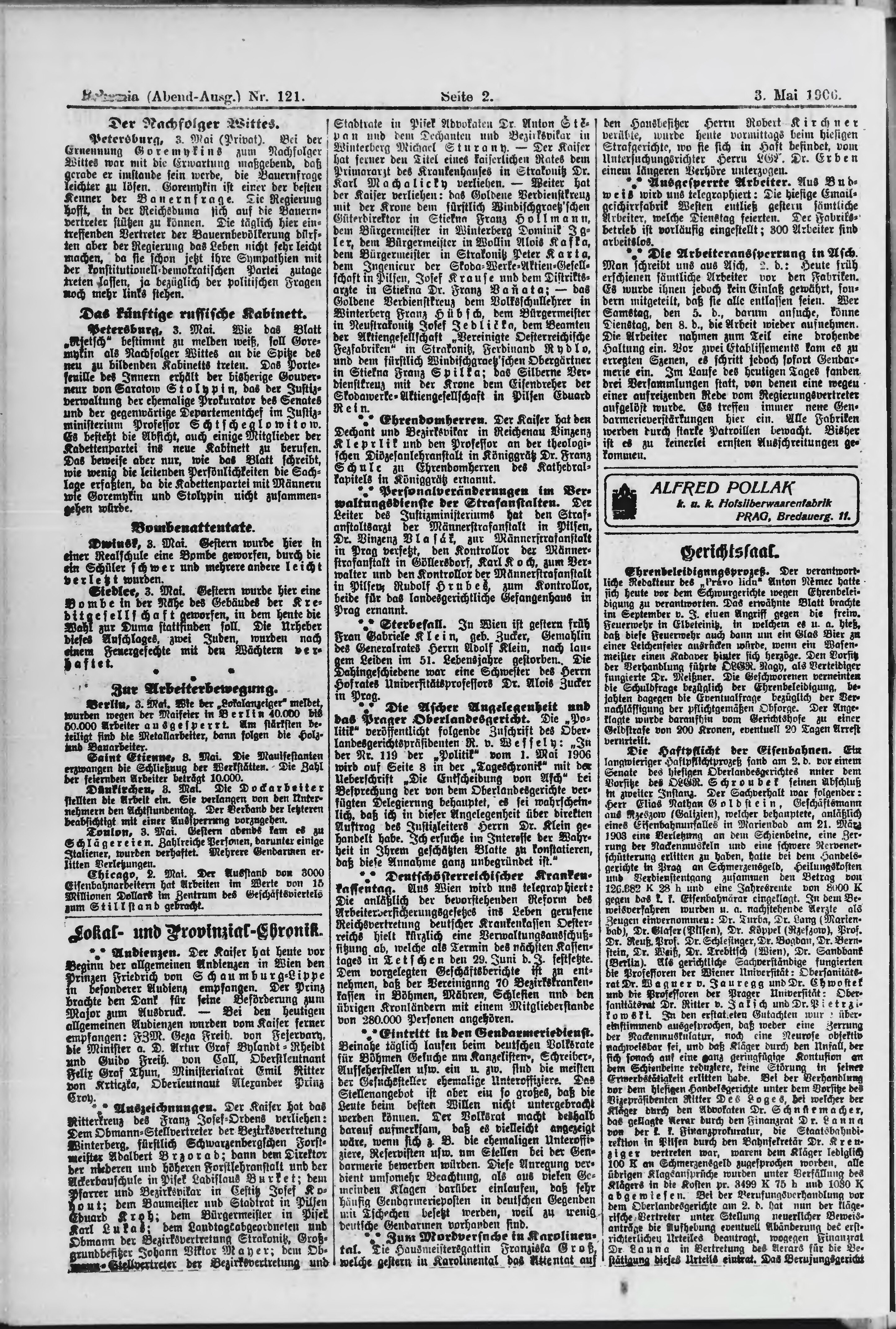 * Datum vydání výtisku: 3.5.1906 Číslo výtisku: 121 Poznámky k výtisku: večerní vydání;