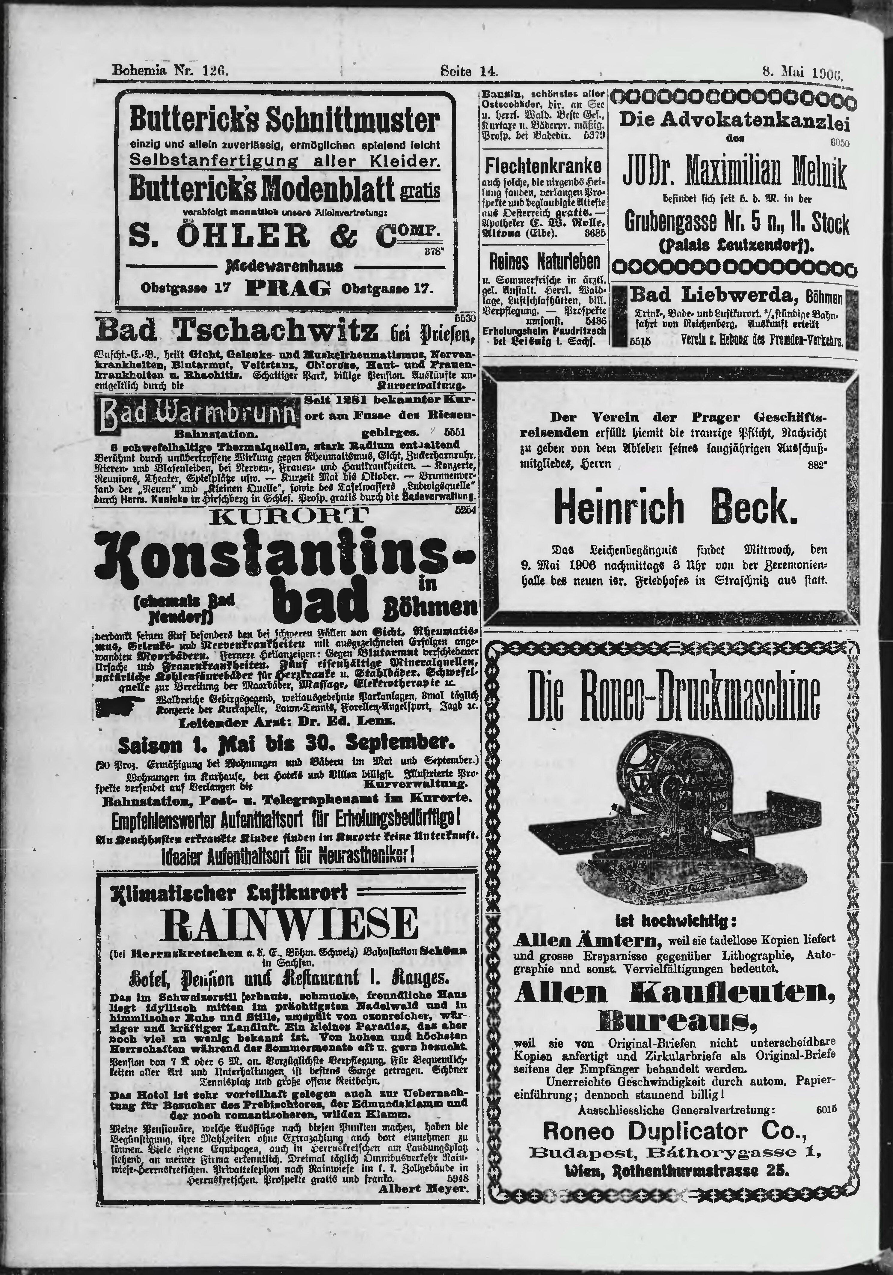 * Datum vydání výtisku: 8.5.1906 Číslo výtisku: 126 Poznámky k výtisku: ranní vydání;
