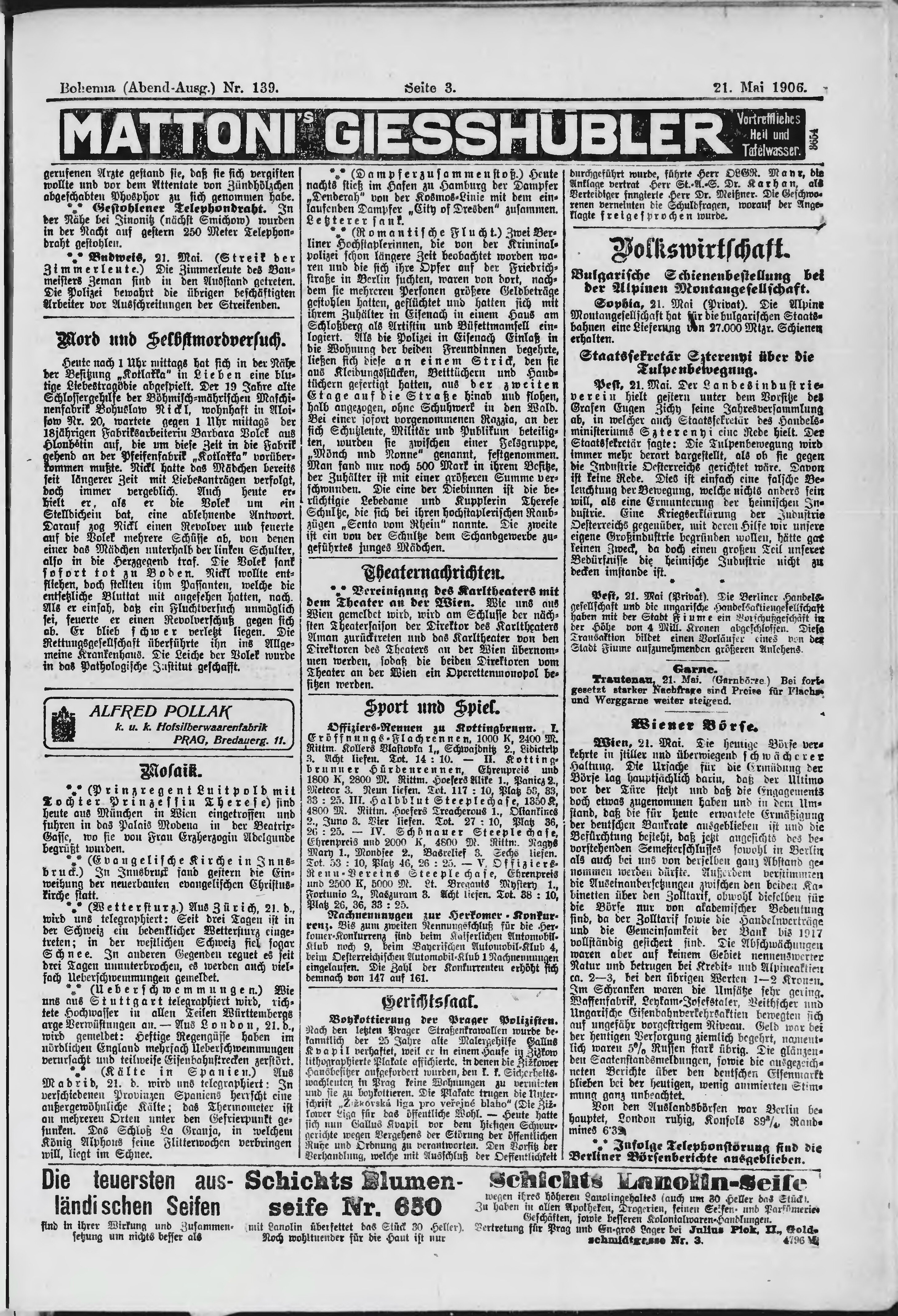 * Datum vydání výtisku: 21.5.1906 Číslo výtisku: 139 Poznámky k výtisku: večerní vydání;