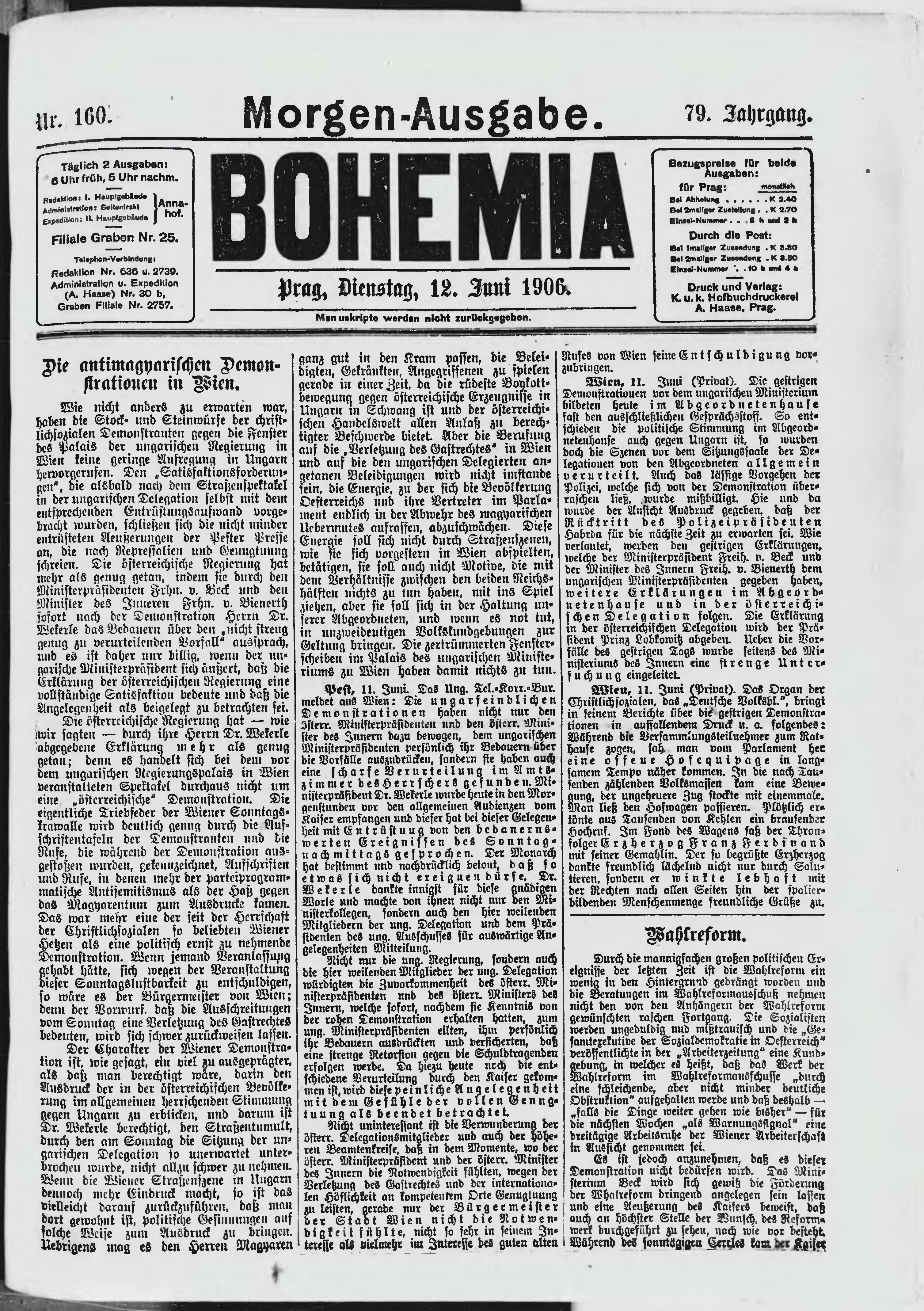 * Datum vydání výtisku: 12.6.1906 Číslo výtisku: 160 Poznámky k výtisku: ranní vydání;