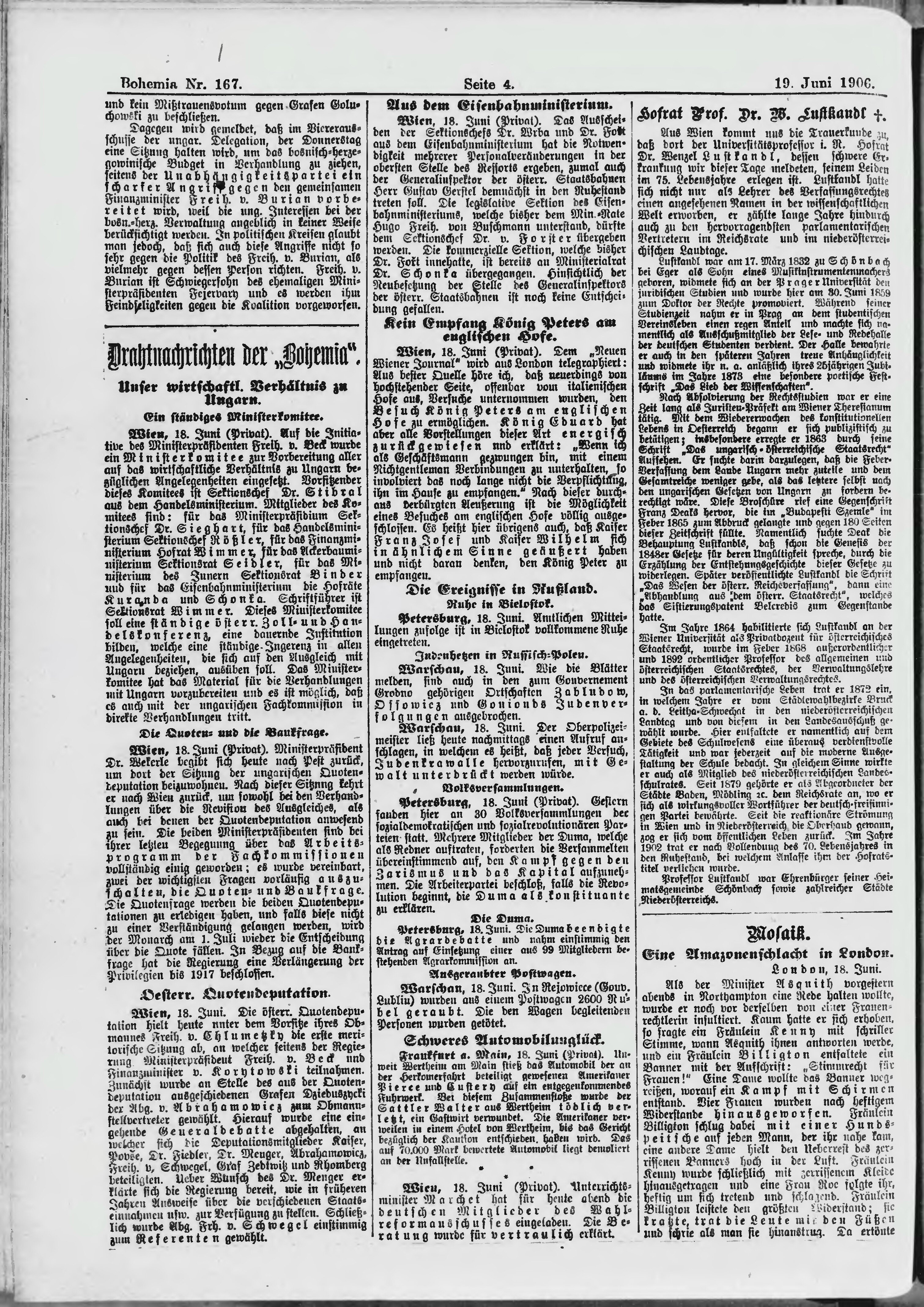 * Datum vydání výtisku: 19.6.1906 Číslo výtisku: 167 Poznámky k výtisku: ranní vydání;
