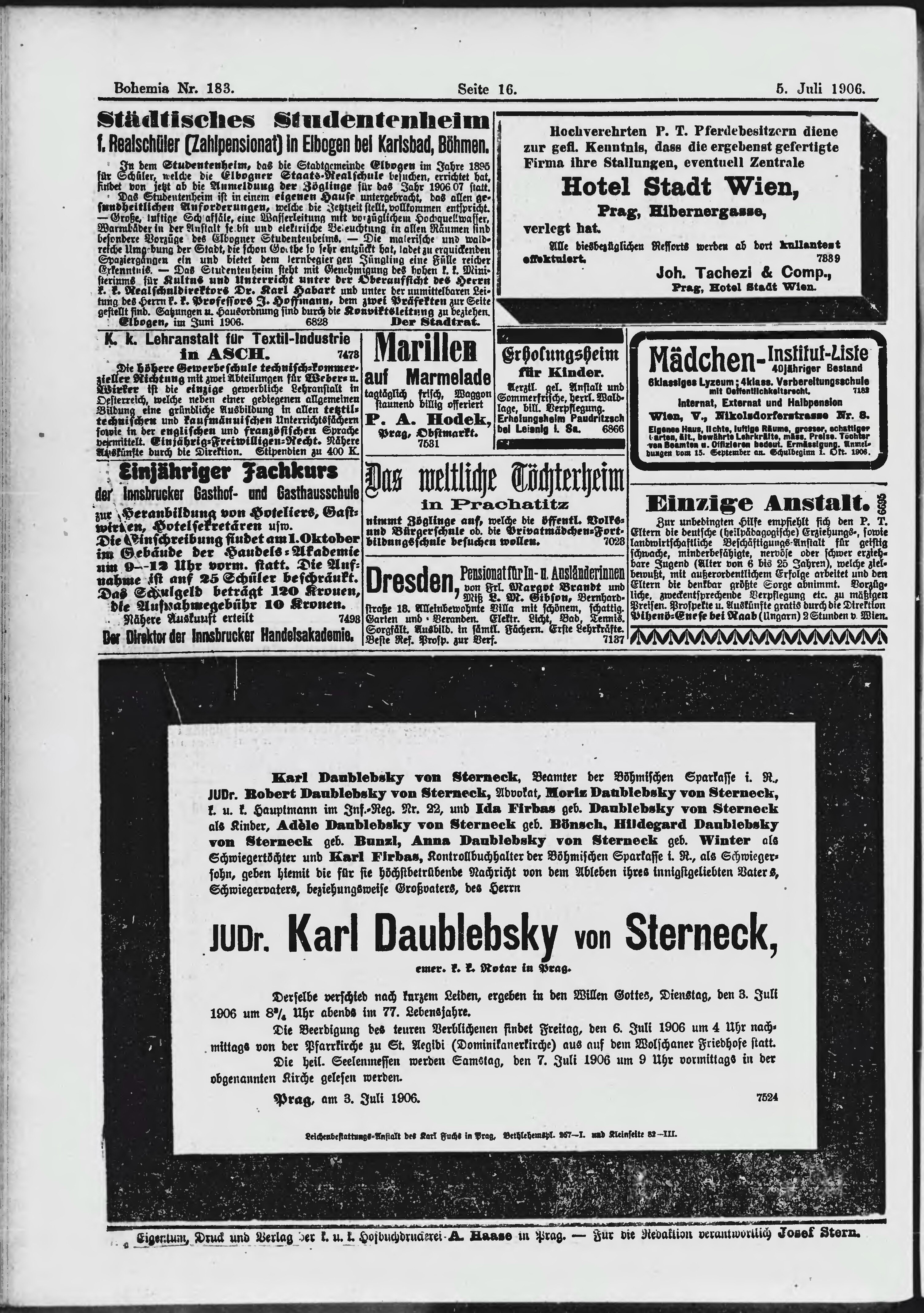 * Datum vydání výtisku: 5.7.1906 Číslo výtisku: 183 Poznámky k výtisku: ranní vydání;