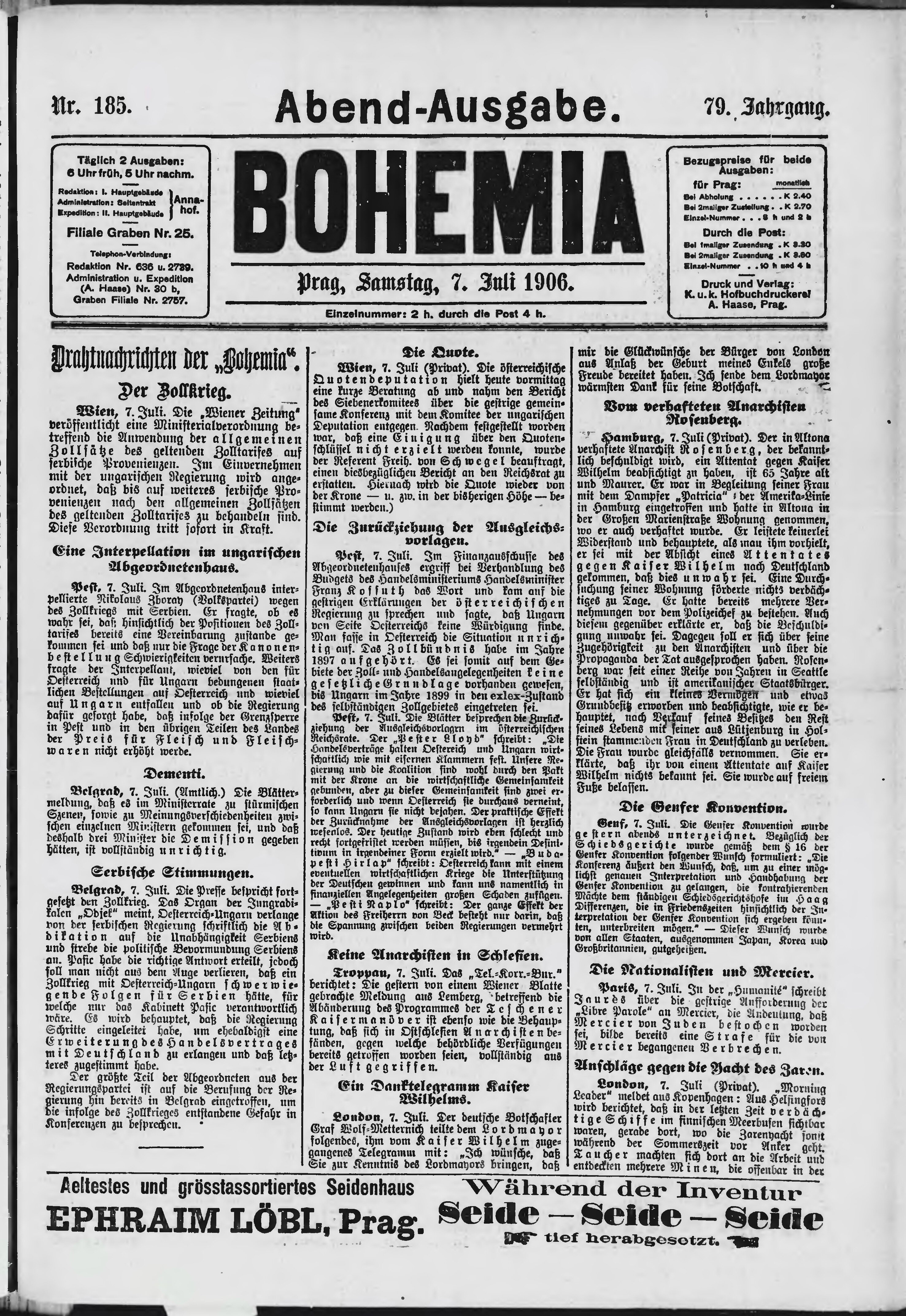 * Datum vydání výtisku: 7.7.1906 Číslo výtisku: 185 Poznámky k výtisku: večerní vydání;