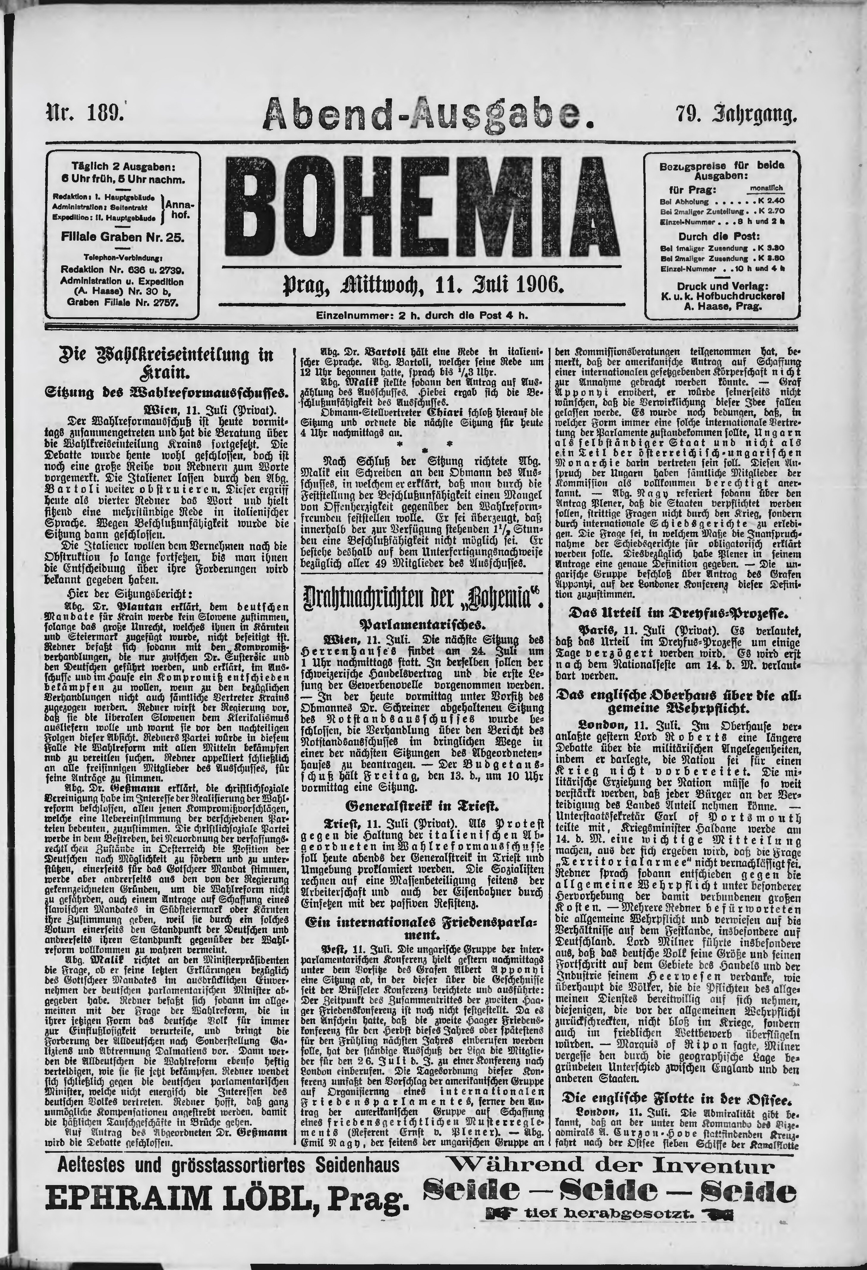 * Datum vydání výtisku: 11.7.1906 Číslo výtisku: 189 Poznámky k výtisku: večerní vydání;