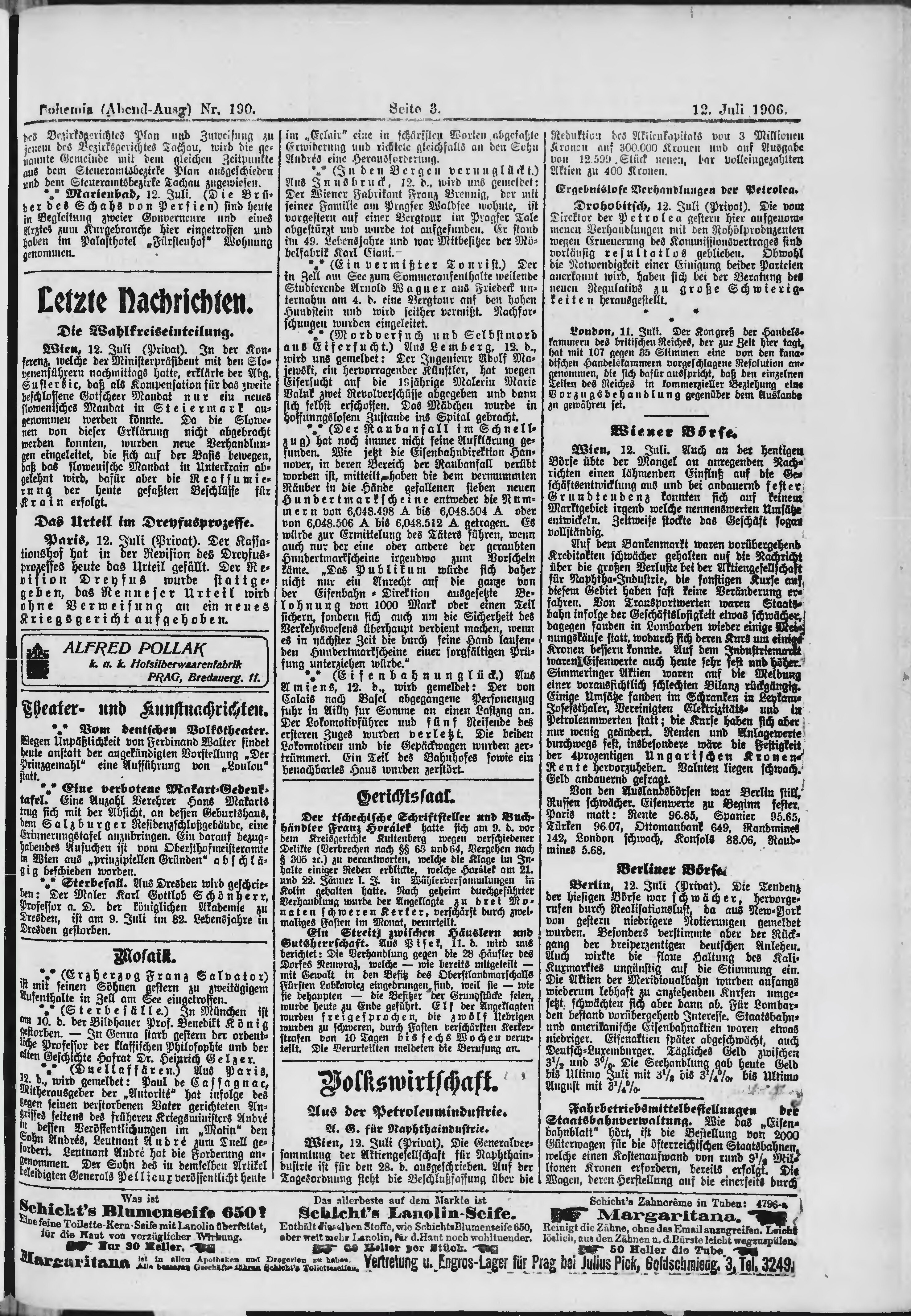 * Datum vydání výtisku: 12.7.1906 Číslo výtisku: 190 Poznámky k výtisku: večerní vydání;