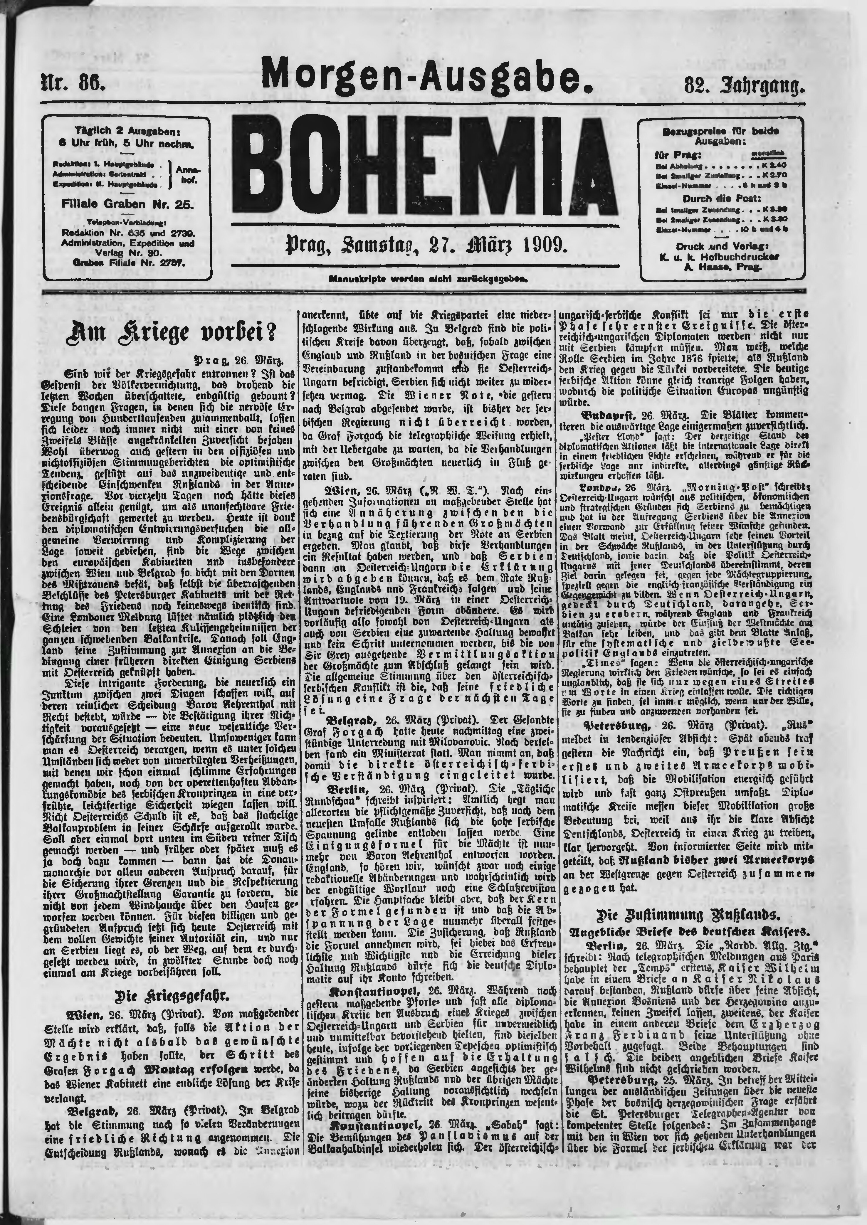 * Datum vydání výtisku: 27.3.1909 Číslo výtisku: 86 Poznámky k výtisku: ranní vydání;
