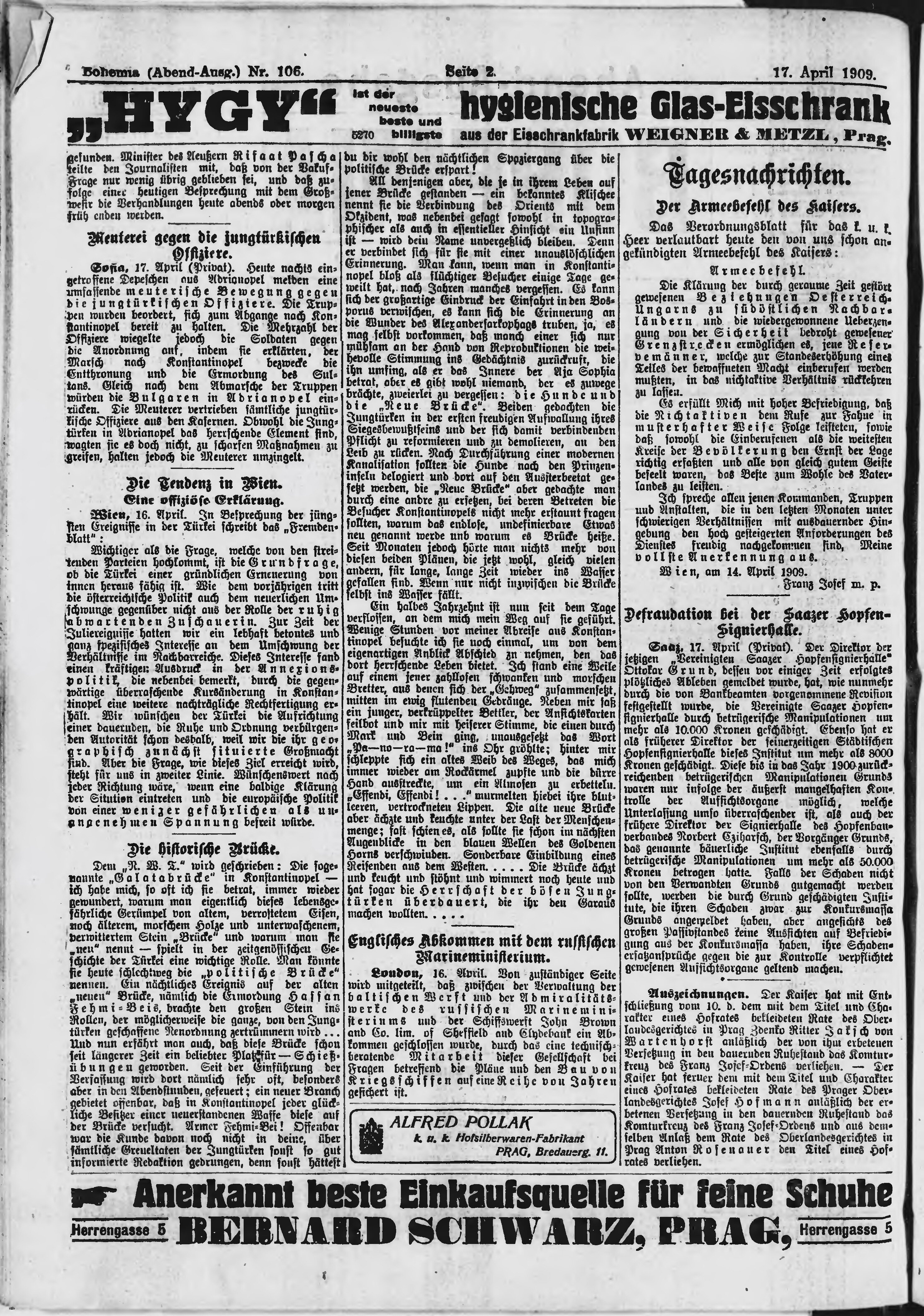 * Datum vydání výtisku: 17.4.1909 Číslo výtisku: 106 Poznámky k výtisku: večerní vydání;