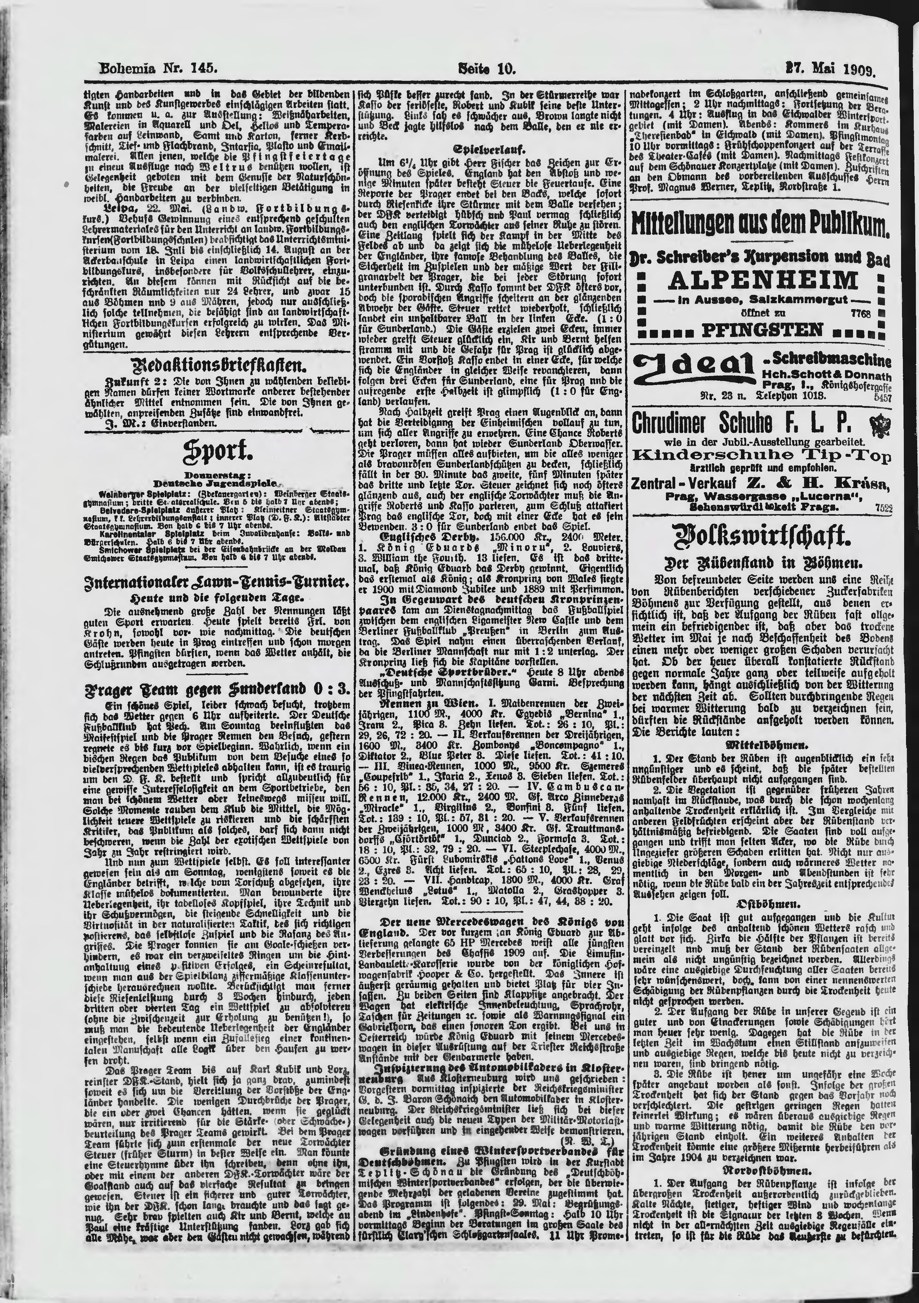 * Datum vydání výtisku: 27.5.1909 Číslo výtisku: 145 Poznámky k výtisku: ranní vydání;