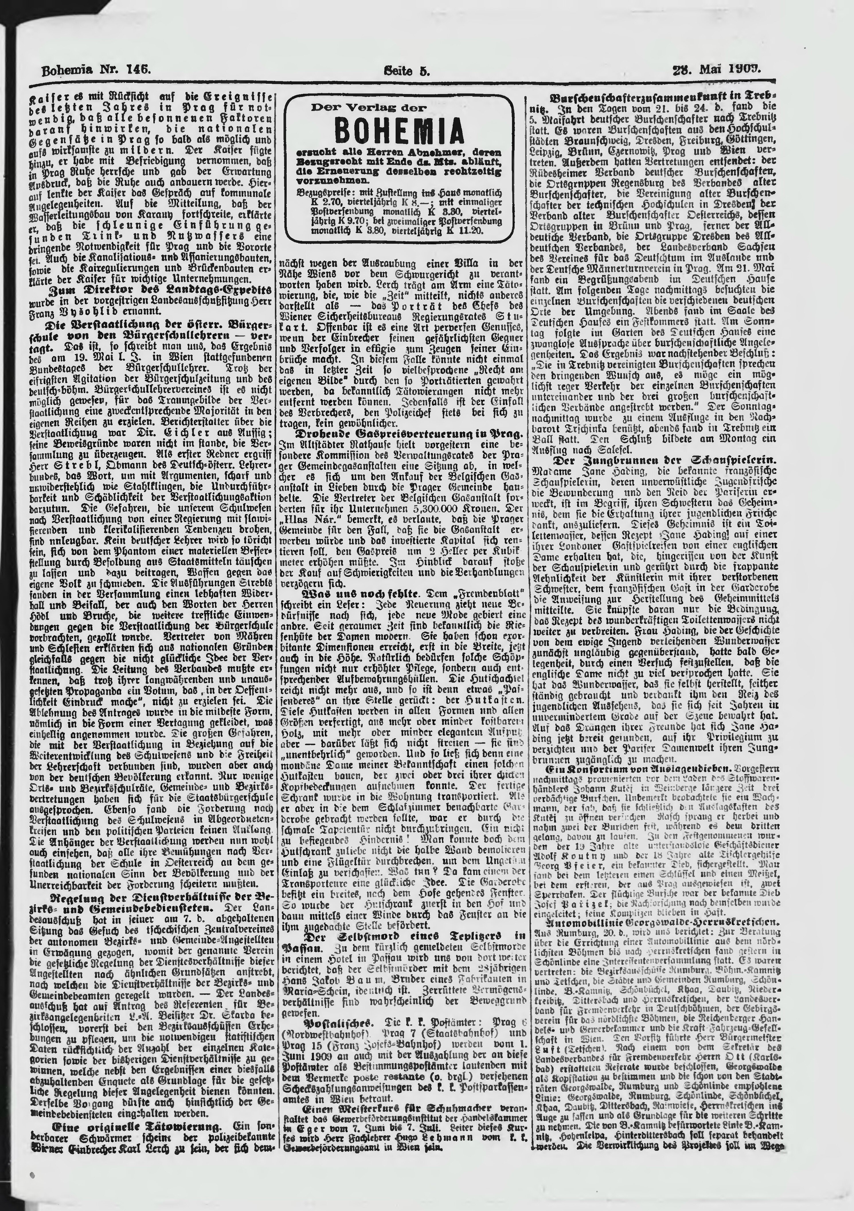 * Datum vydání výtisku: 28.5.1909 Číslo výtisku: 146 Poznámky k výtisku: ranní vydání;