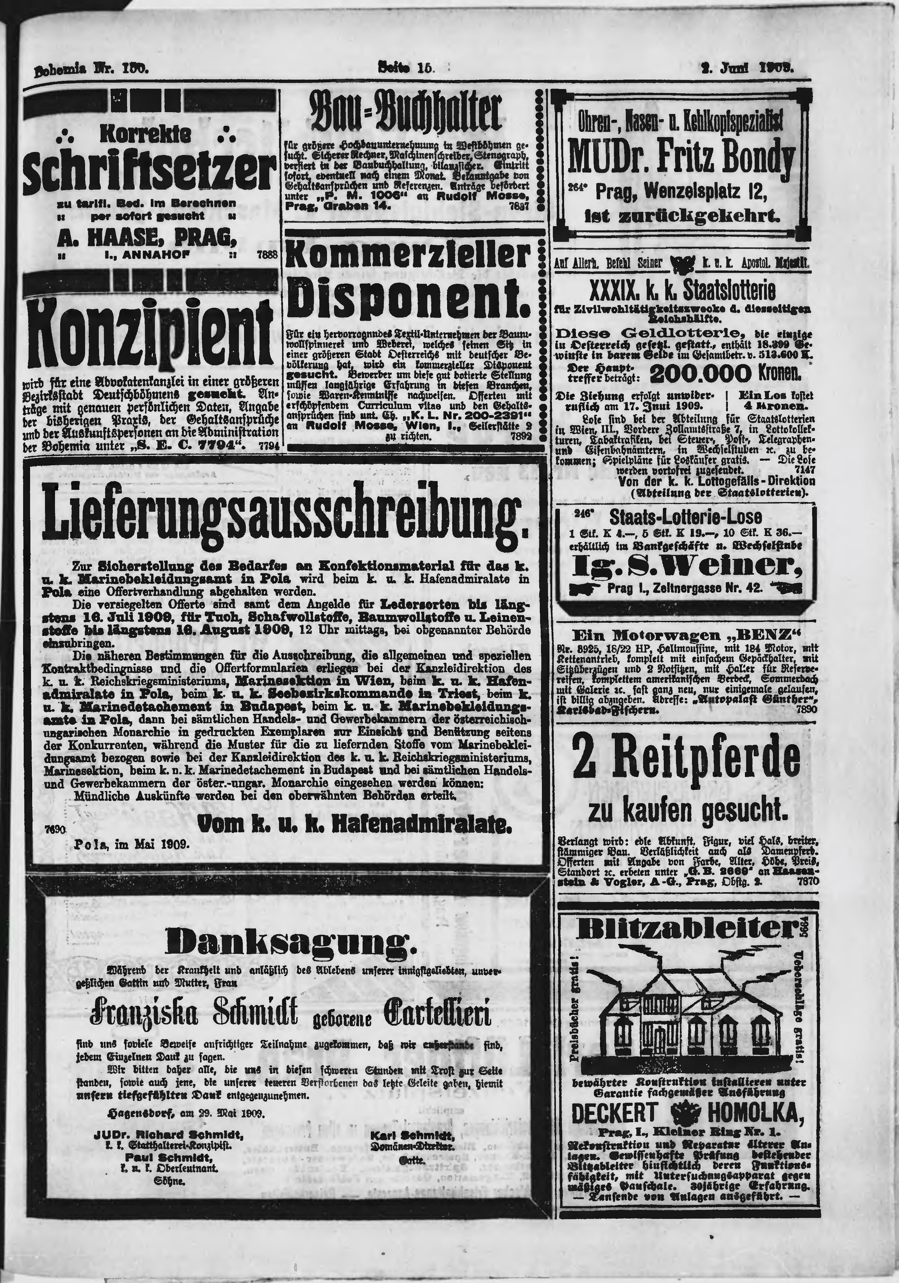 * Datum vydání výtisku: 2.6.1909 Číslo výtisku: 150 Poznámky k výtisku: ranní vydání;