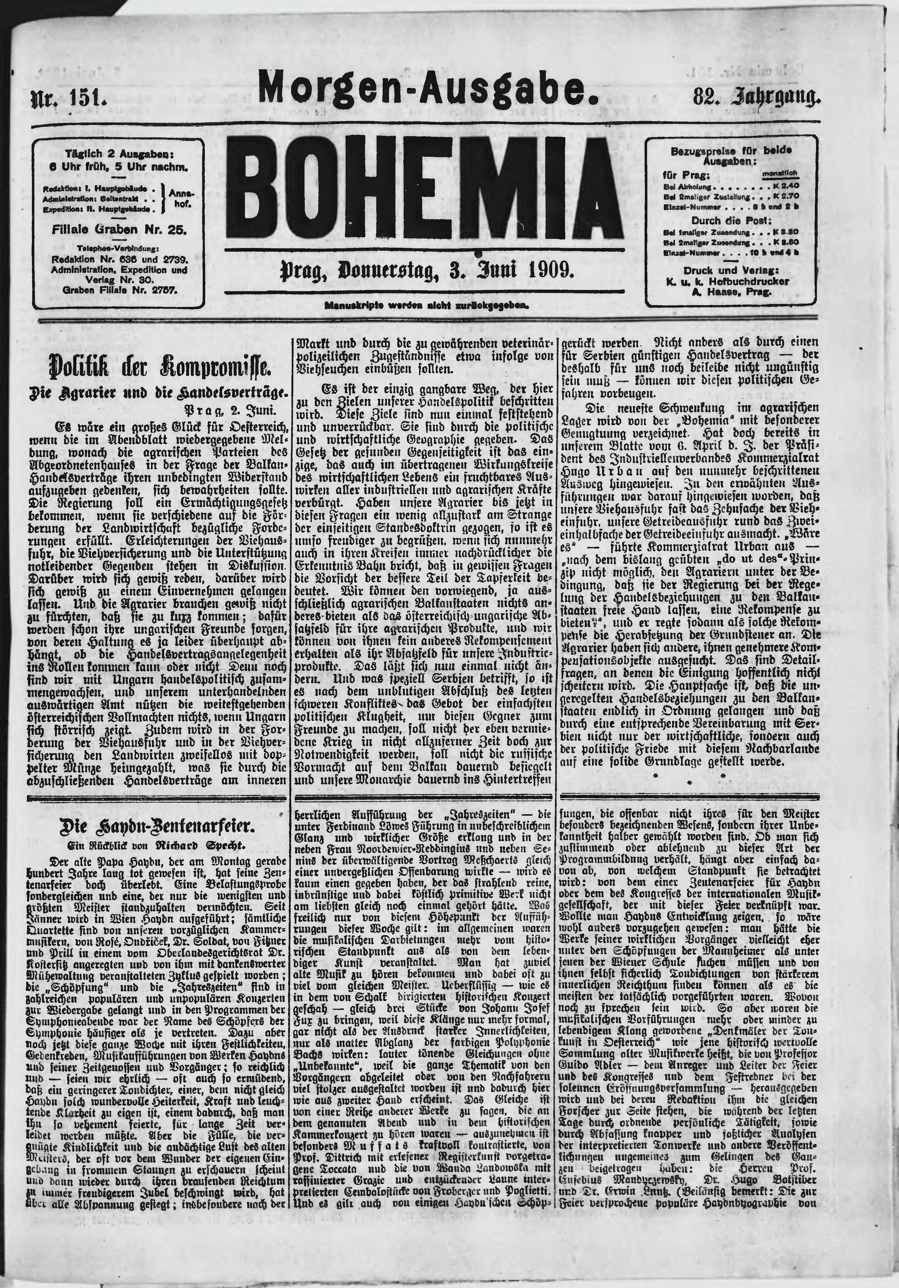 * Datum vydání výtisku: 3.6.1909 Číslo výtisku: 151 Poznámky k výtisku: ranní vydání;