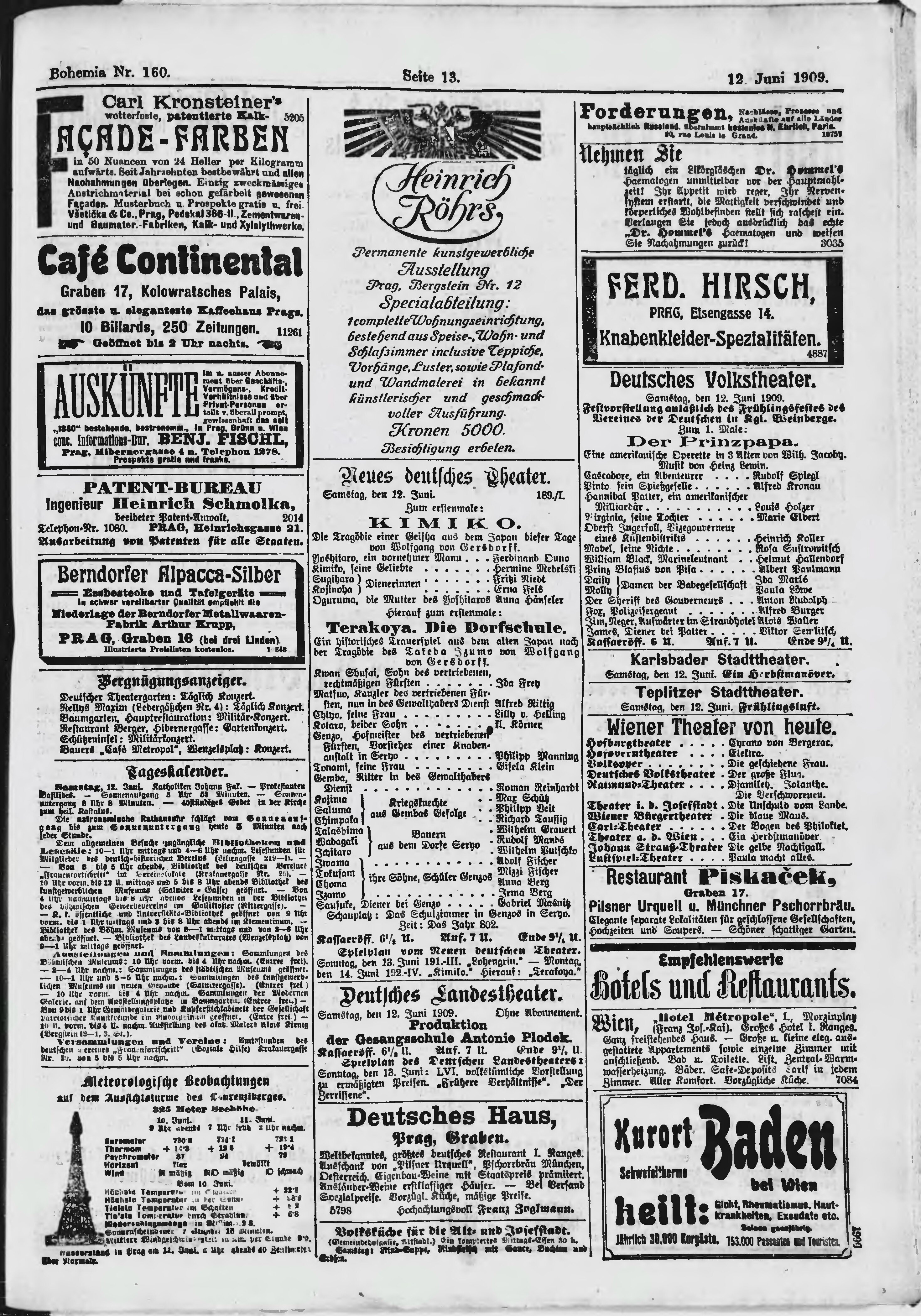 * Datum vydání výtisku: 12.6.1909 Číslo výtisku: 160 Poznámky k výtisku: ranní vydání;