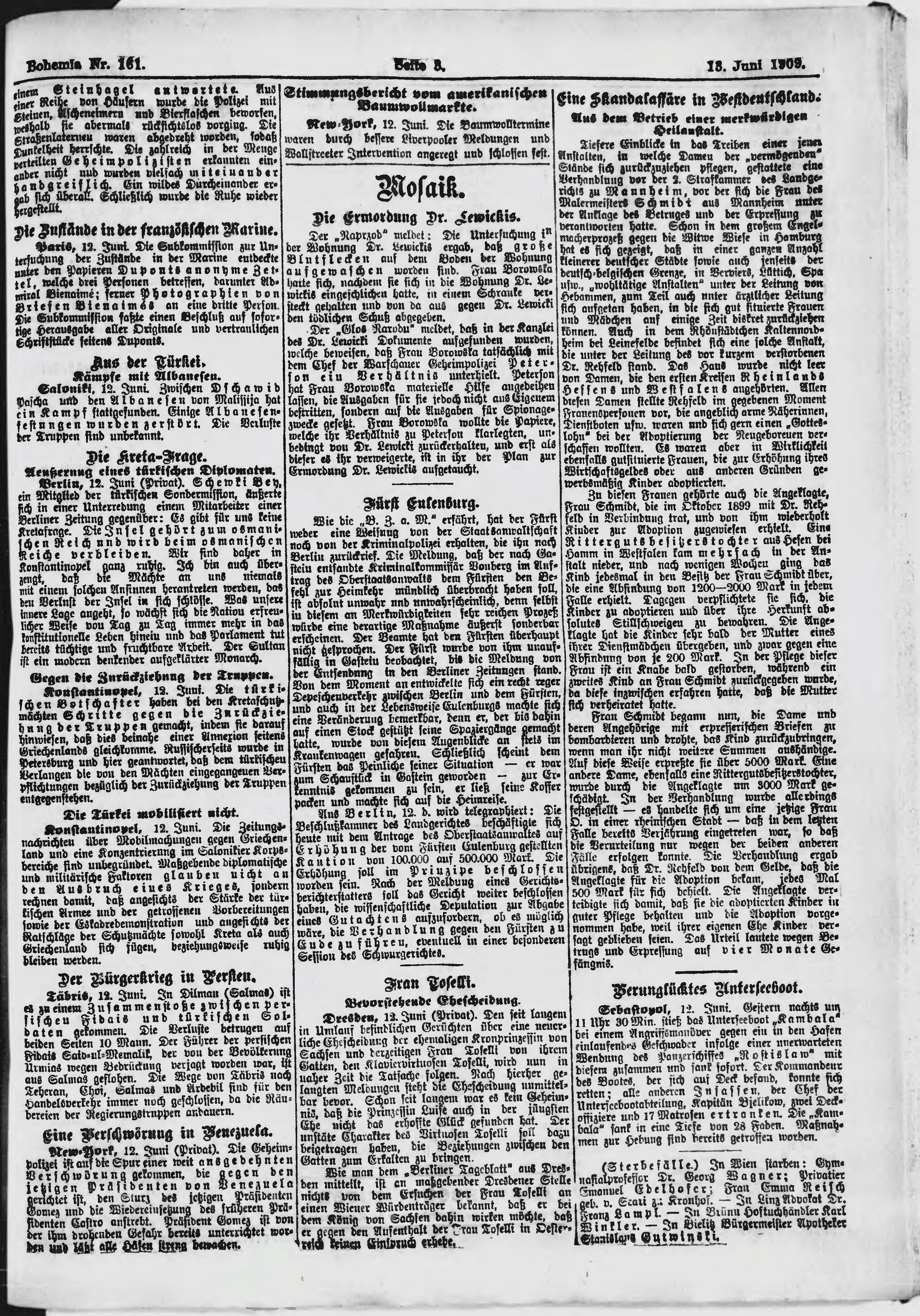* Datum vydání výtisku: 13.6.1909 Číslo výtisku: 161 Poznámky k výtisku: ranní vydání;