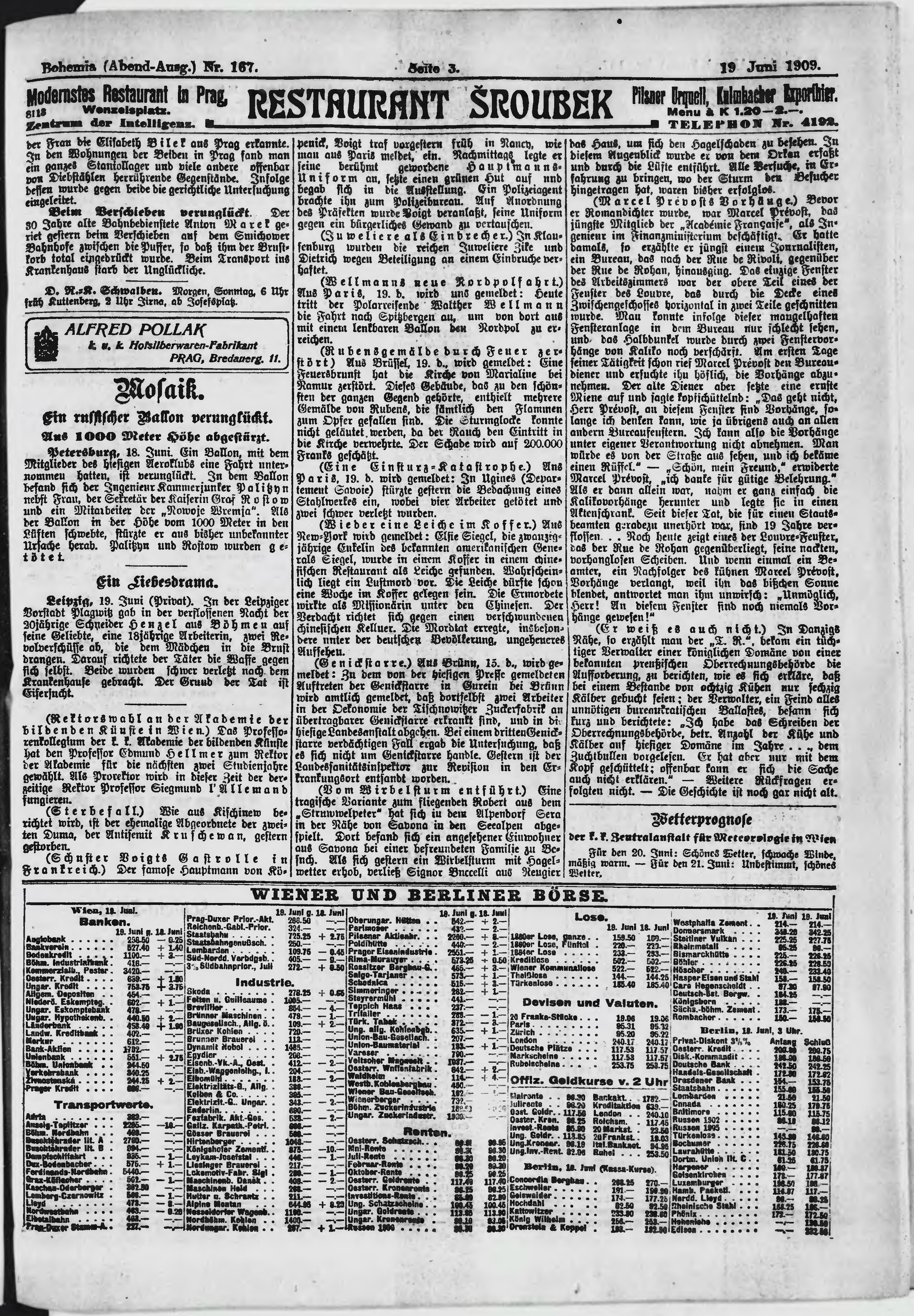 * Datum vydání výtisku: 19.6.1909 Číslo výtisku: 167 Poznámky k výtisku: večerní vydání;