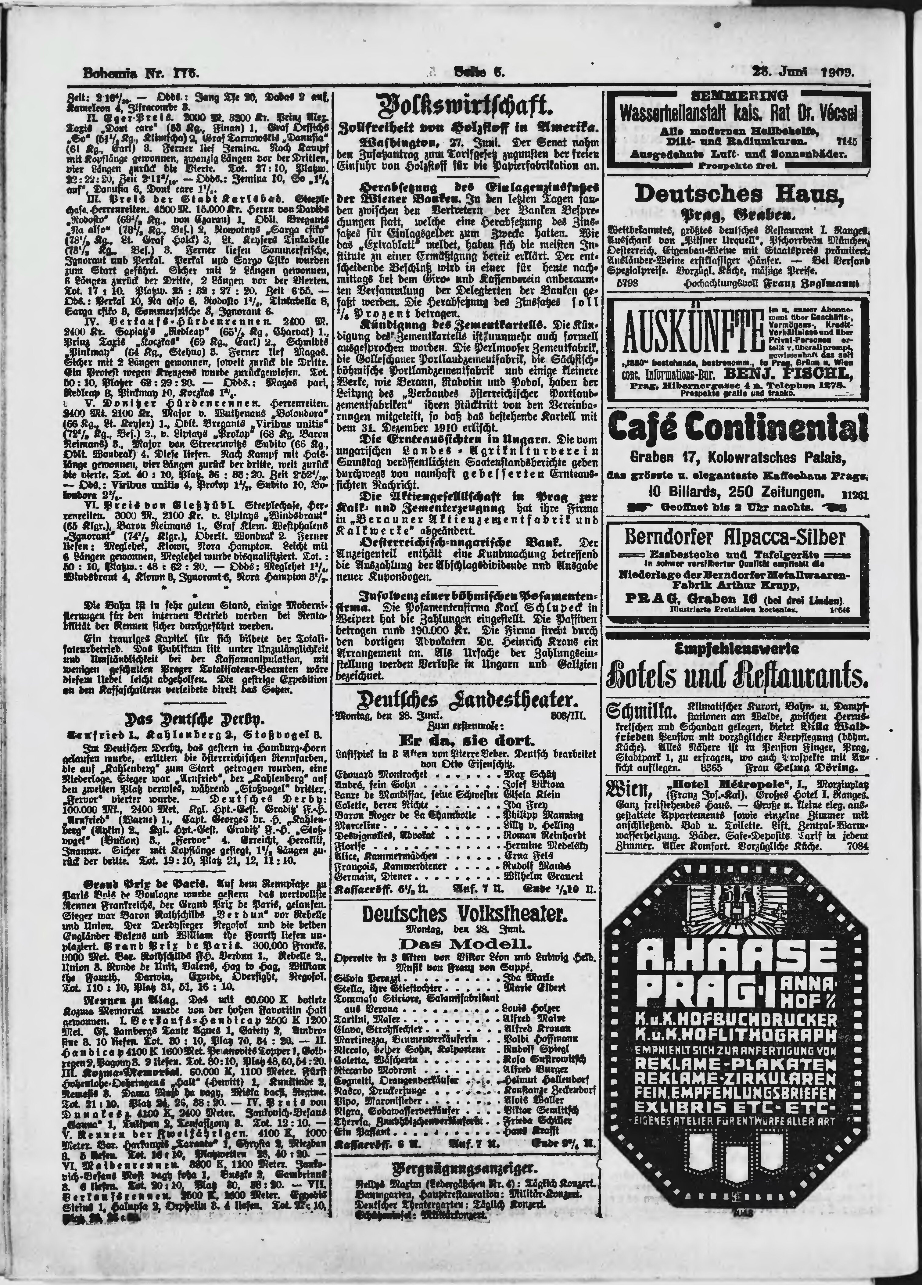 * Datum vydání výtisku: 28.6.1909 Číslo výtisku: 176 Poznámky k výtisku: polední vydání;