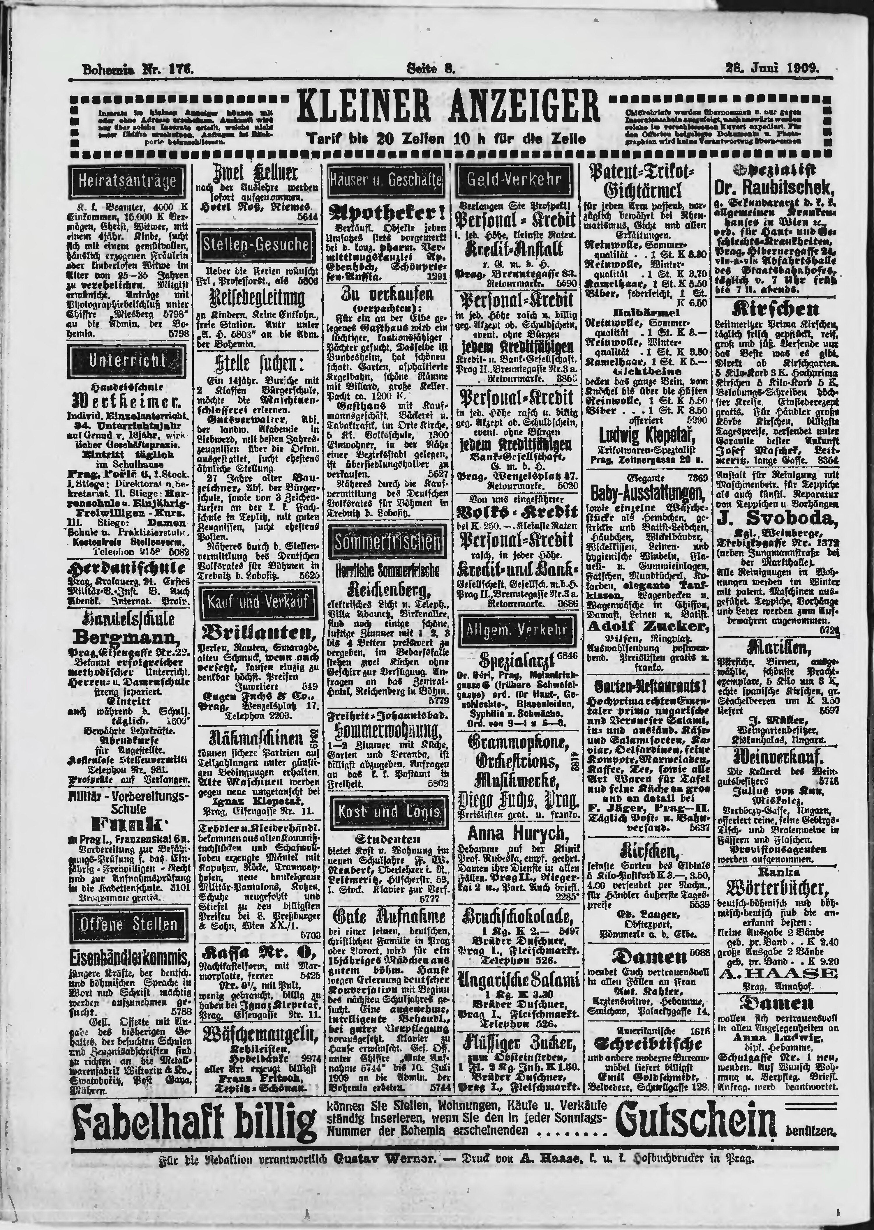 * Datum vydání výtisku: 28.6.1909 Číslo výtisku: 176 Poznámky k výtisku: polední vydání;