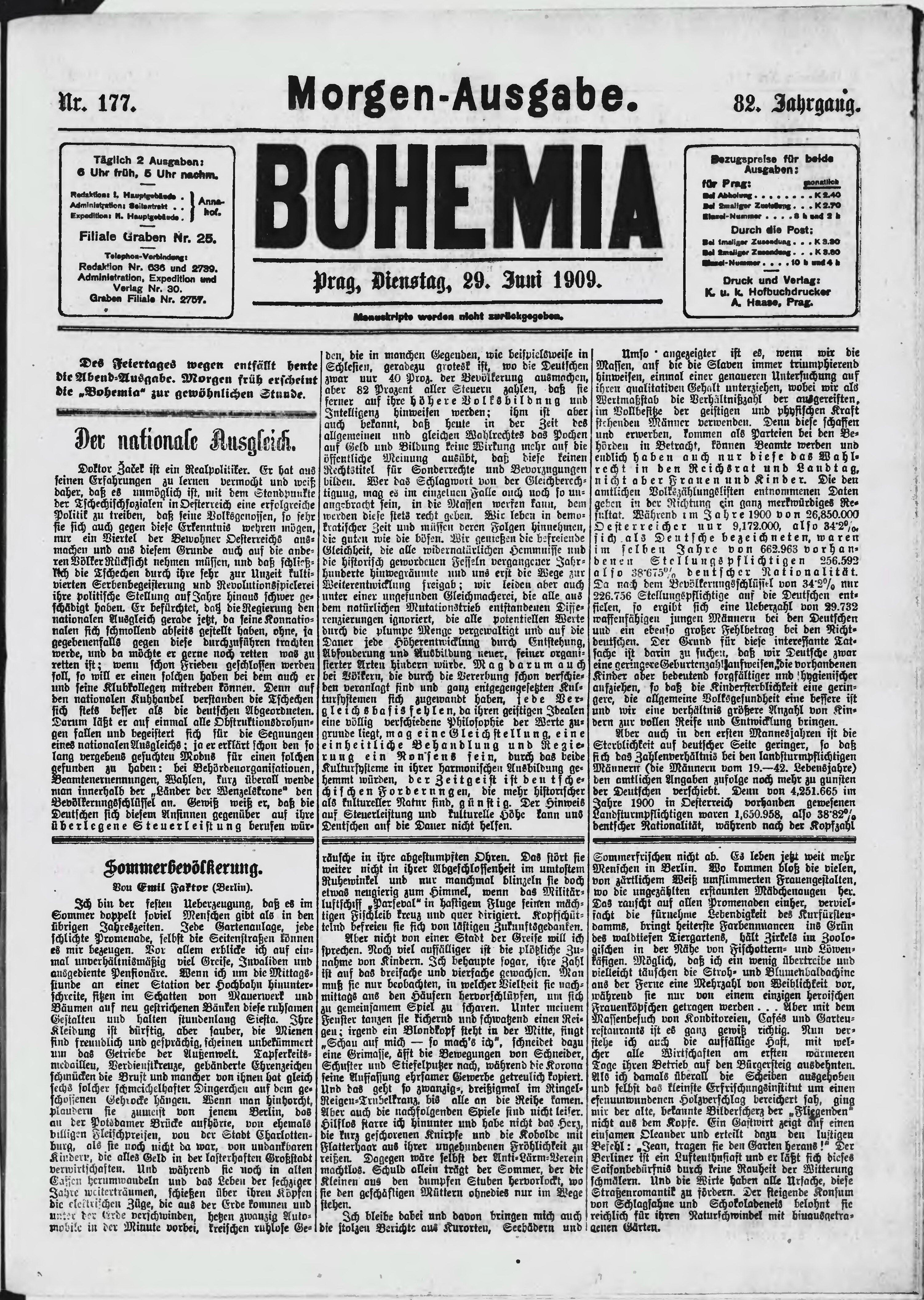 * Datum vydání výtisku: 29.6.1909 Číslo výtisku: 177 Poznámky k výtisku: ranní vydání;