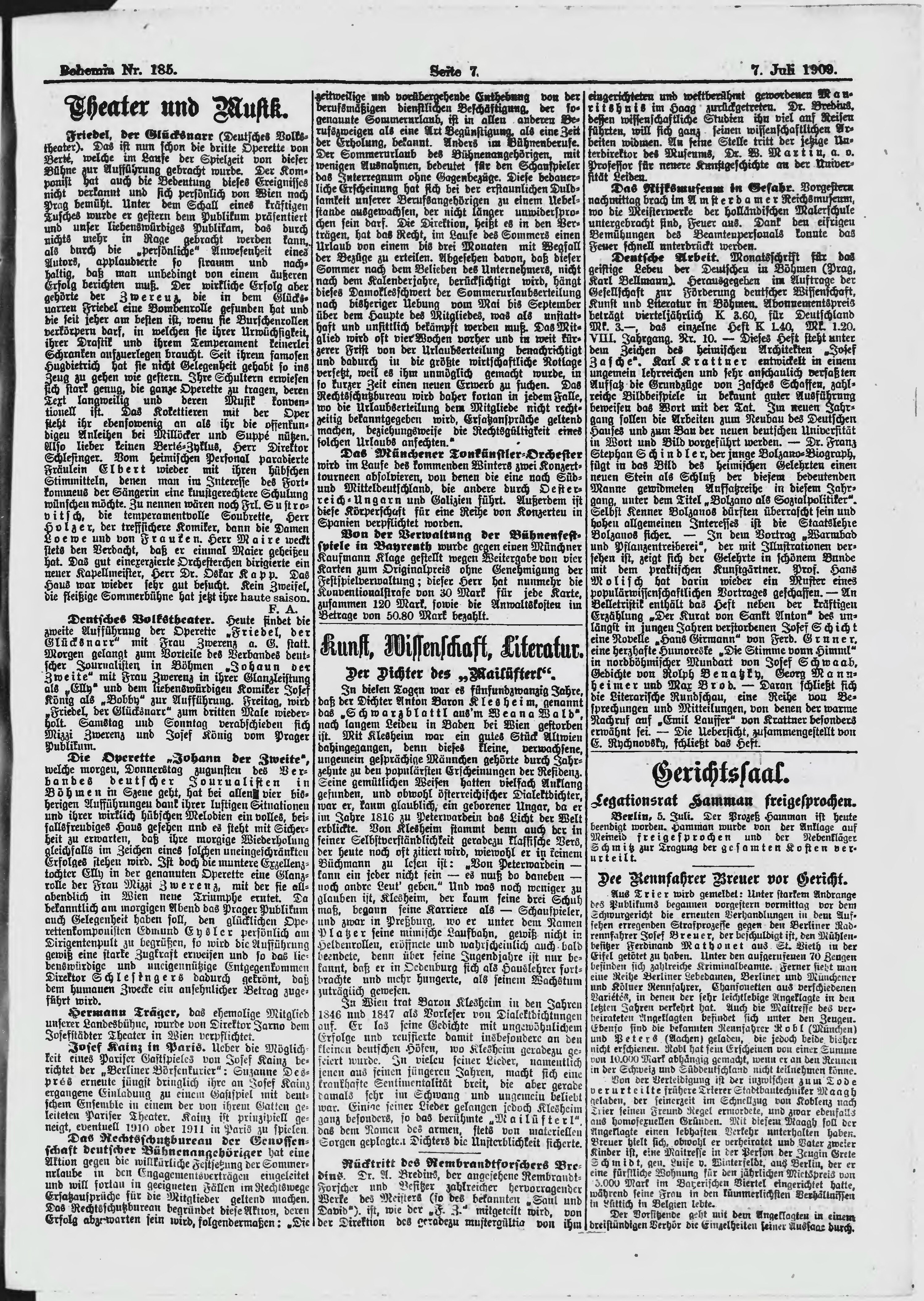 * Datum vydání výtisku: 7.7.1909 Číslo výtisku: 185 Poznámky k výtisku: ranní vydání;