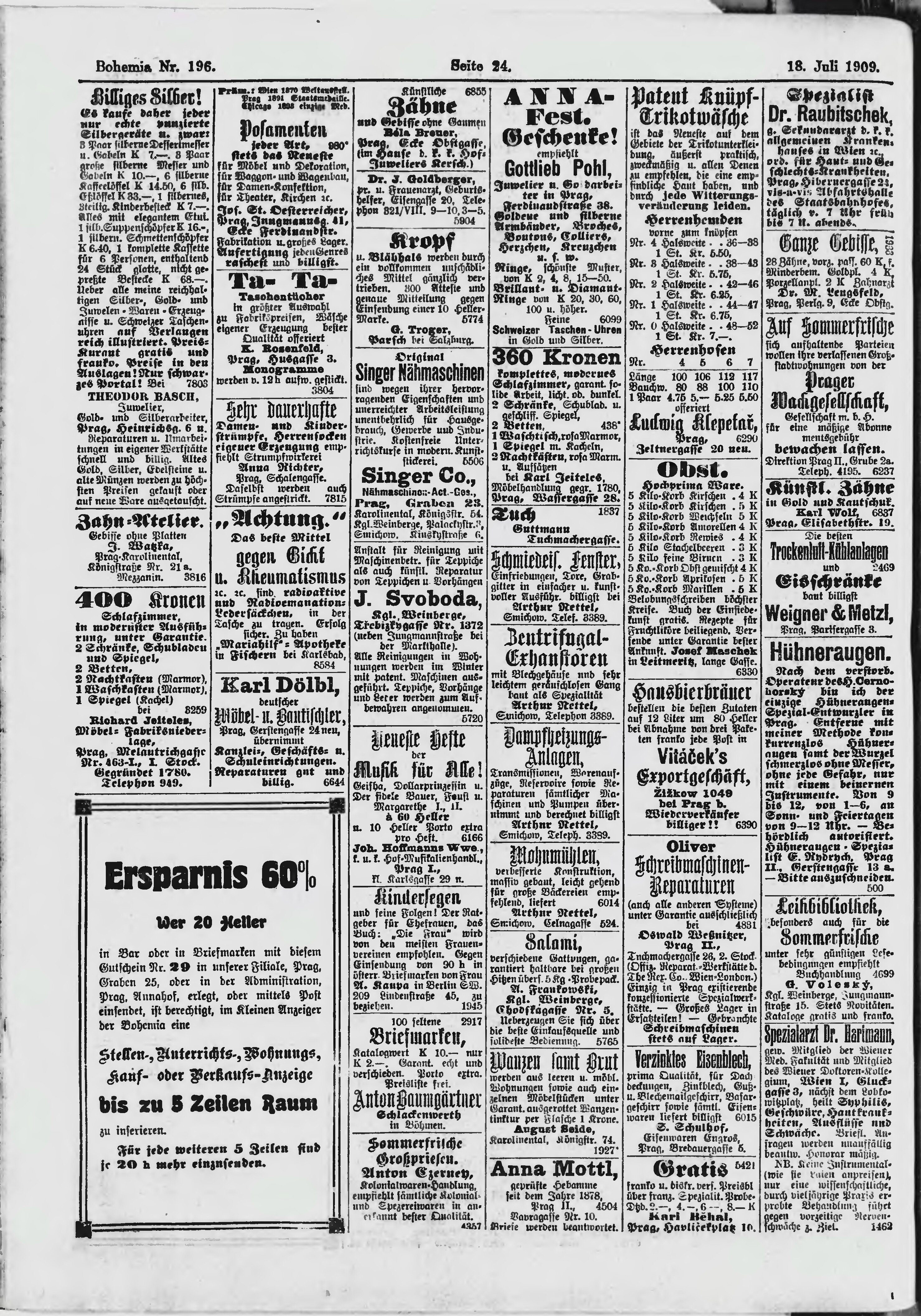 * Datum vydání výtisku: 18.7.1909 Číslo výtisku: 196 Poznámky k výtisku: ranní vydání;