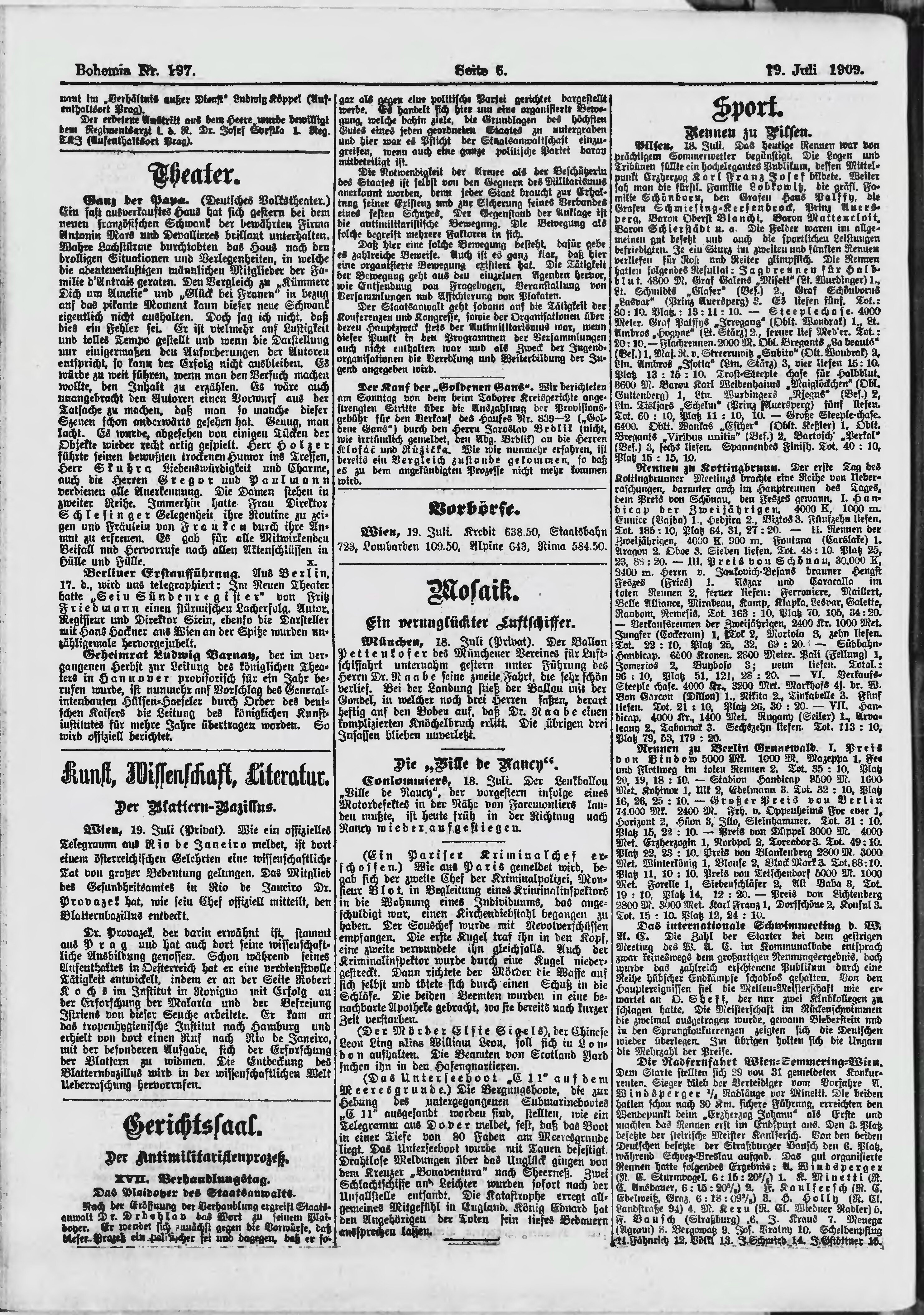 * Datum vydání výtisku: 19.7.1909 Číslo výtisku: 197 Poznámky k výtisku: polední vydání;