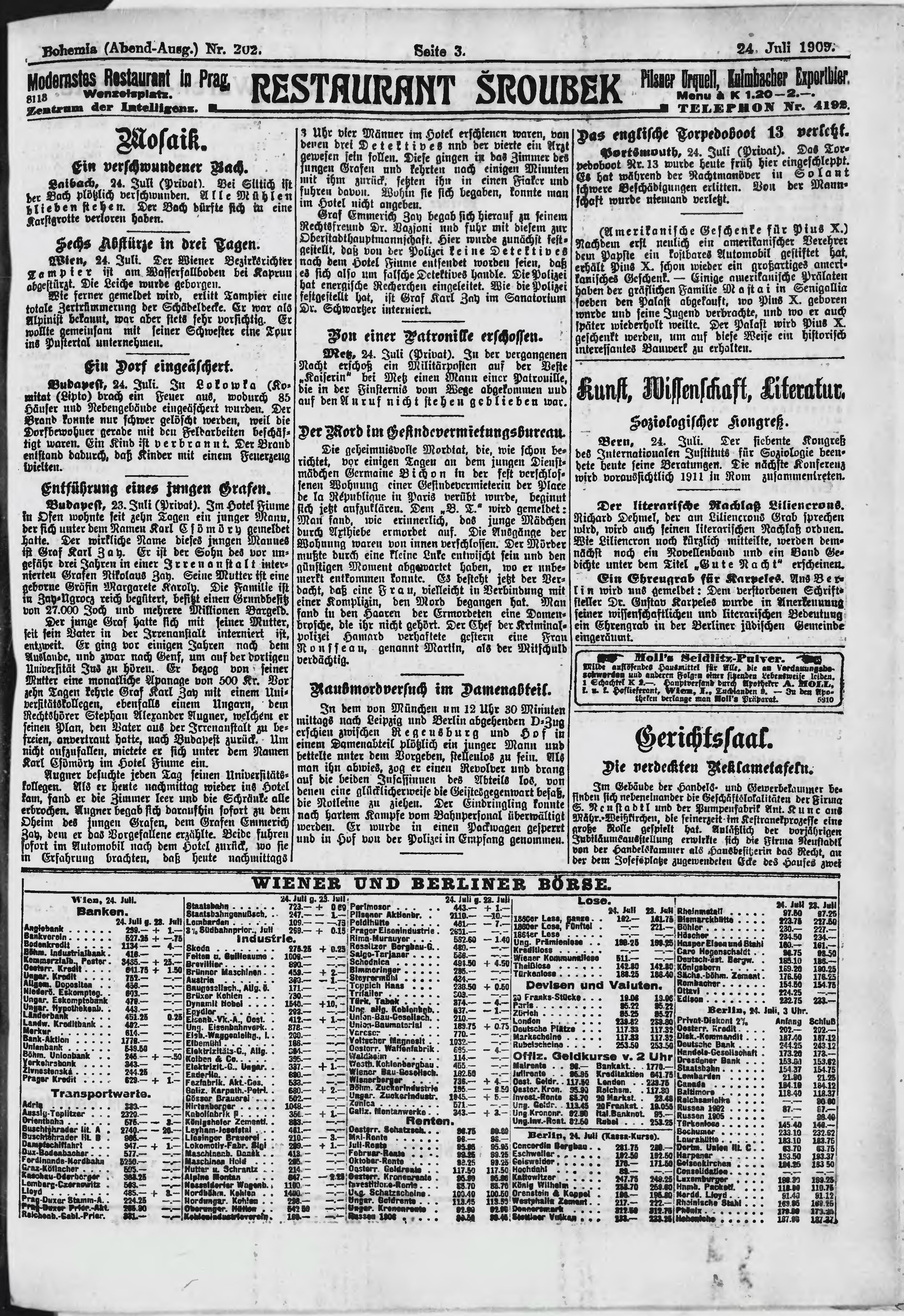 * Datum vydání výtisku: 24.7.1909 Číslo výtisku: 202 Poznámky k výtisku: večerní vydání;