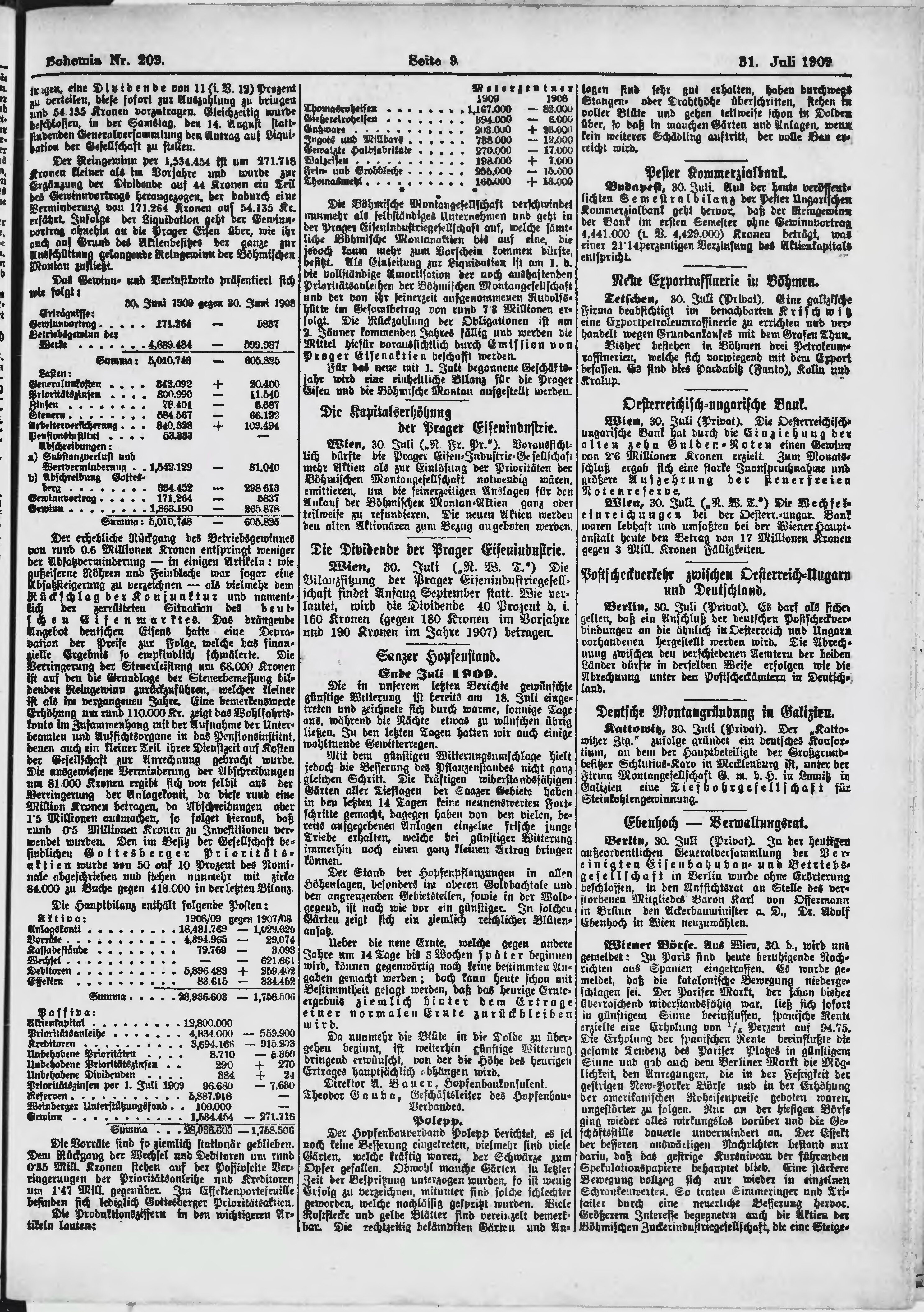 * Datum vydání výtisku: 31.7.1909 Číslo výtisku: 209 Poznámky k výtisku: ranní vydání;