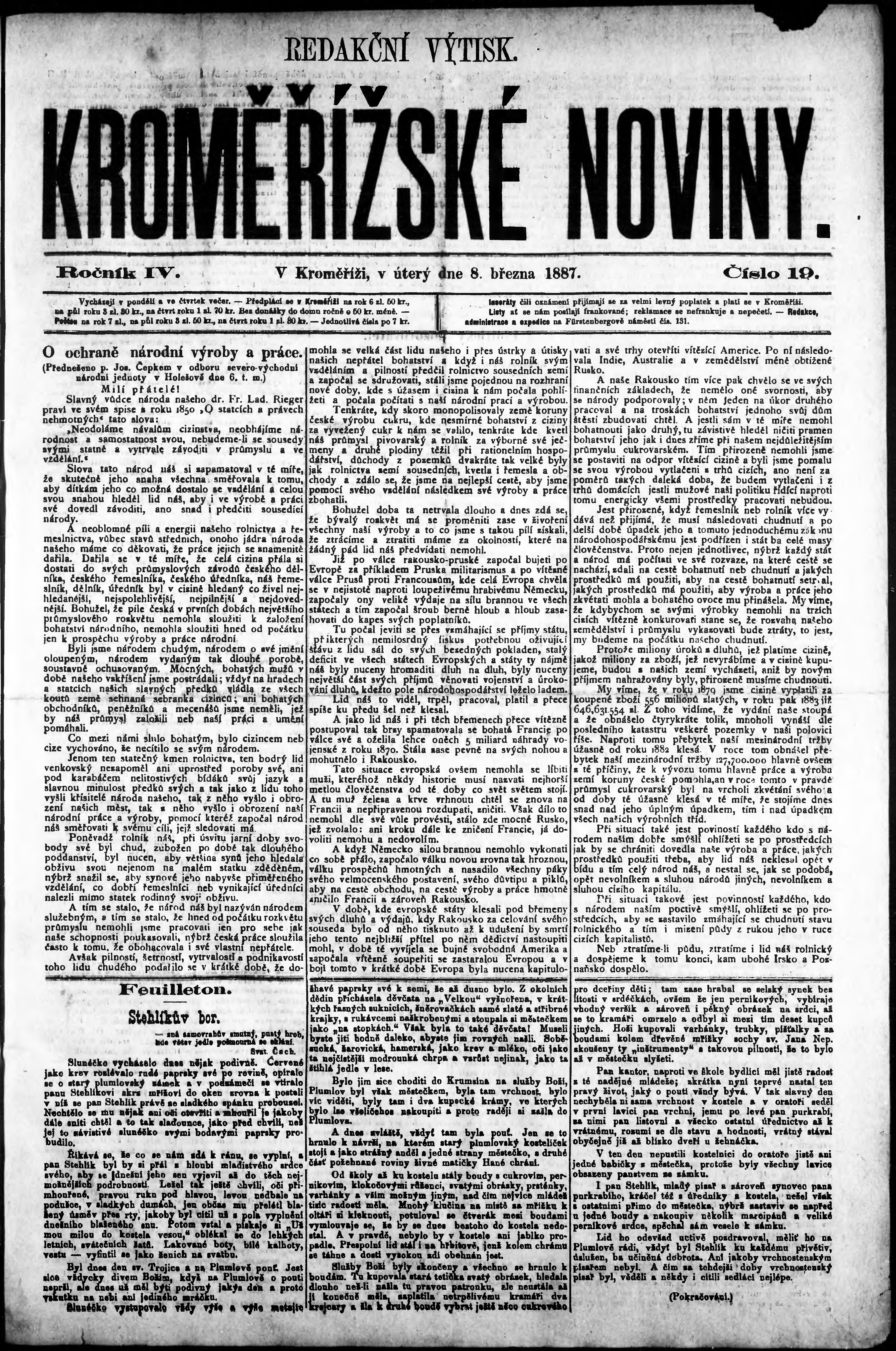 * Datum vydání výtisku: 8.3.1887 Číslo výtisku: 19