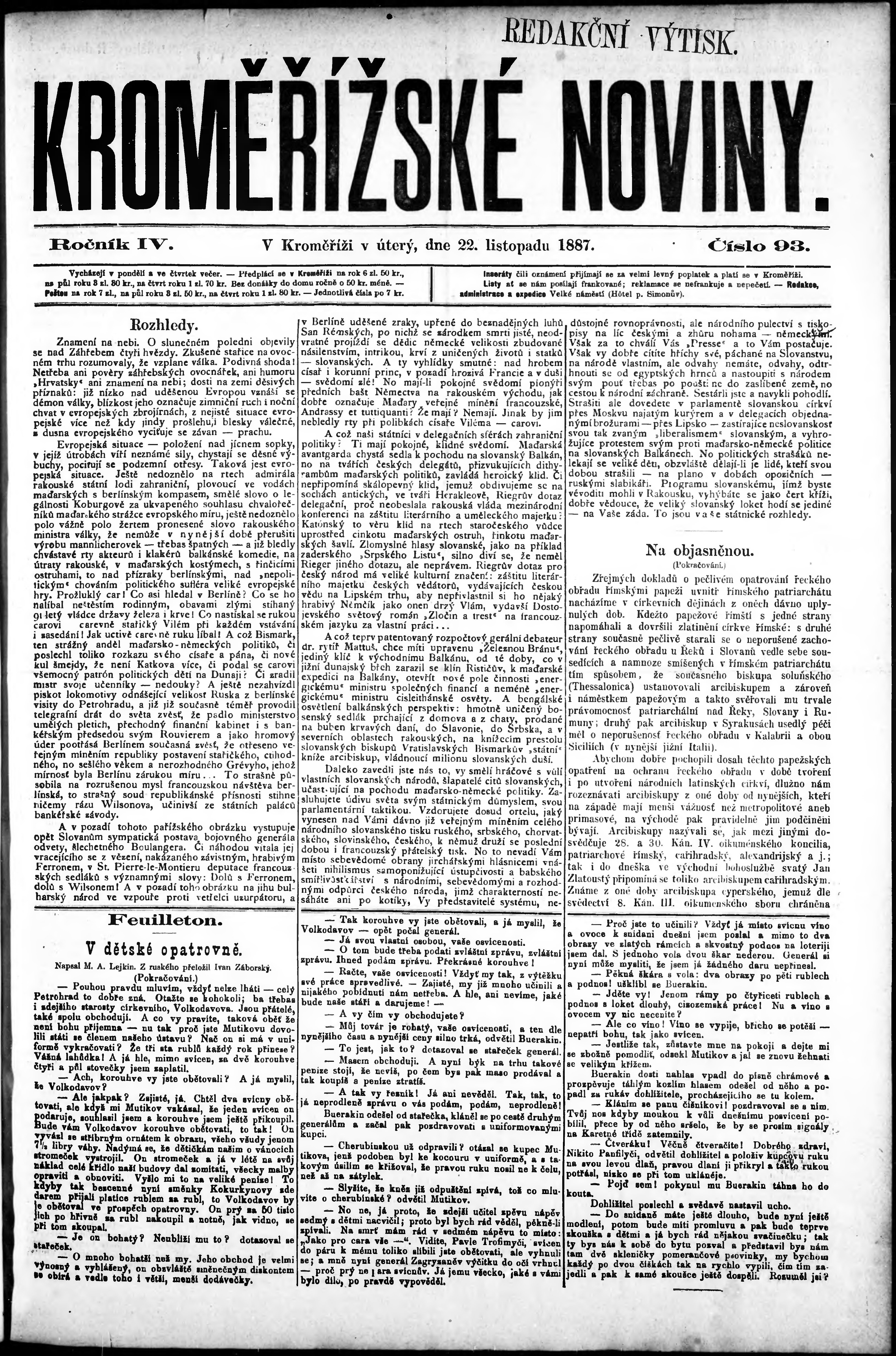 * Datum vydání výtisku: 22.11.1887 Číslo výtisku: 93