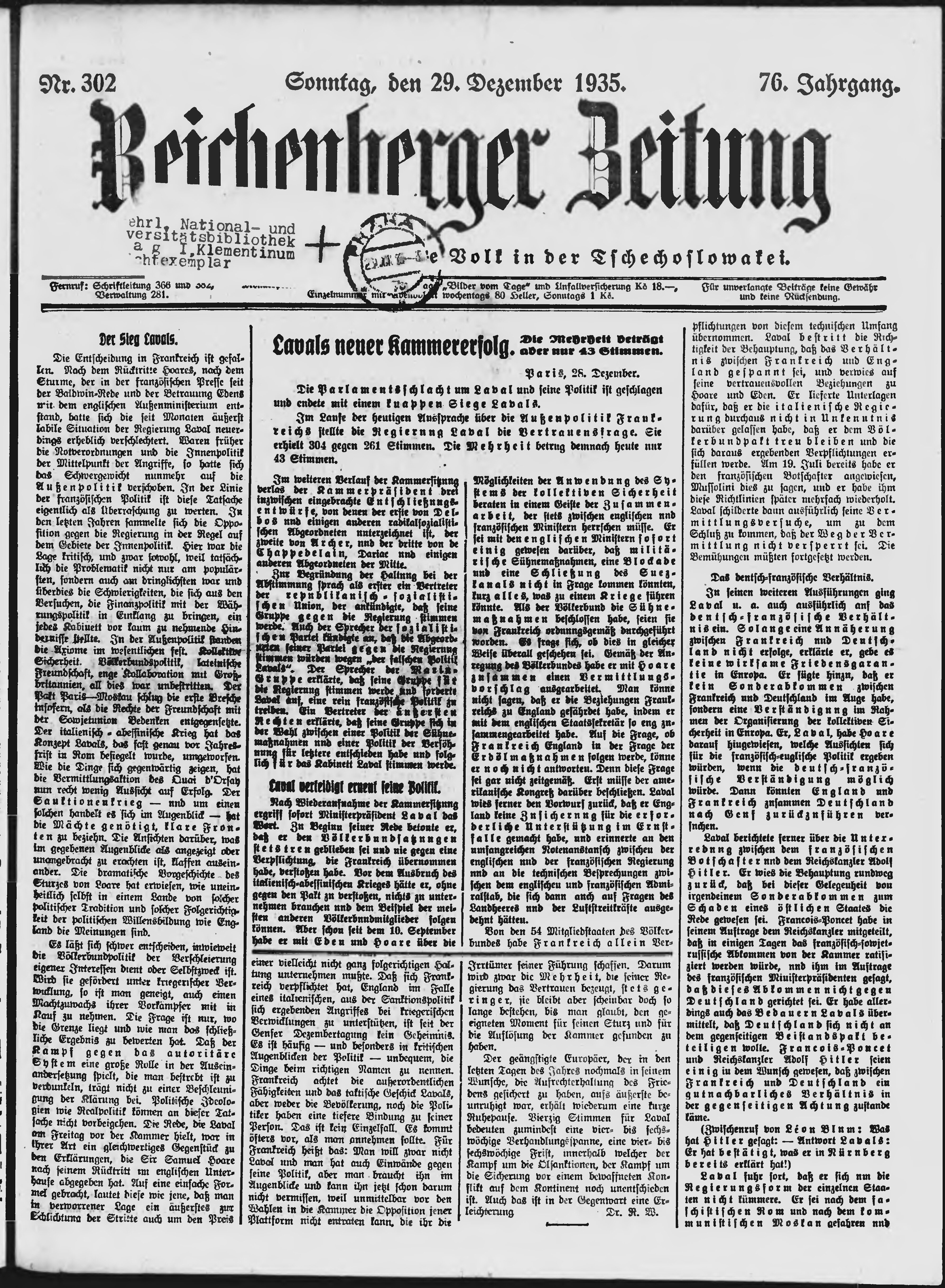 * Datum vydání výtisku: 29.12.1935 Číslo výtisku: 302 Poznámky k výtisku: ranní vydání;