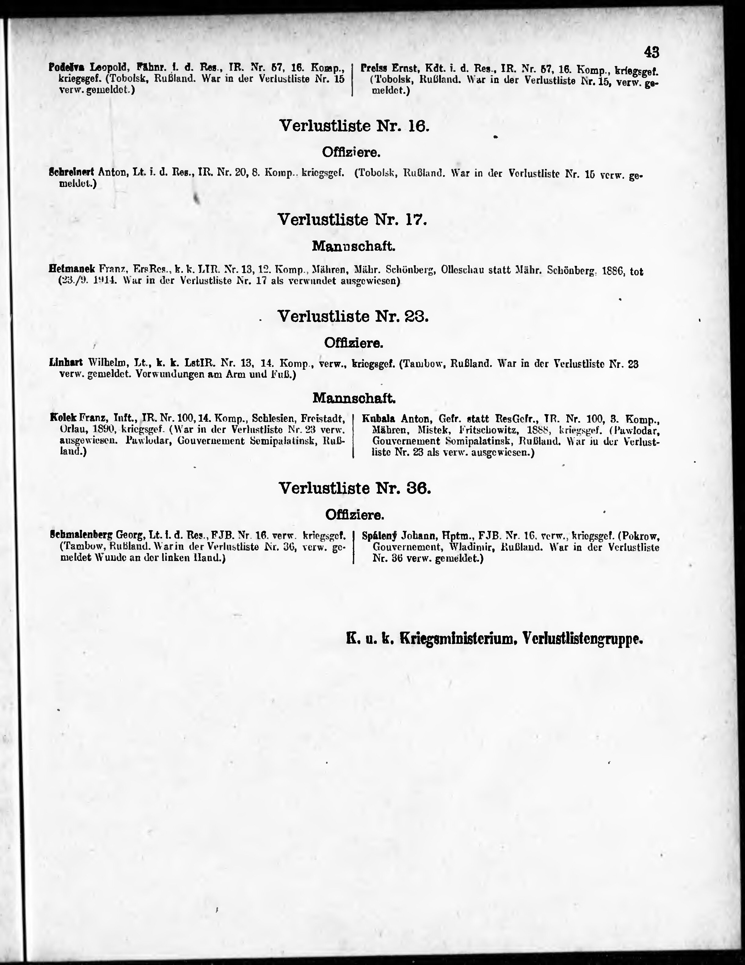 Verlustliste ausgegeben am