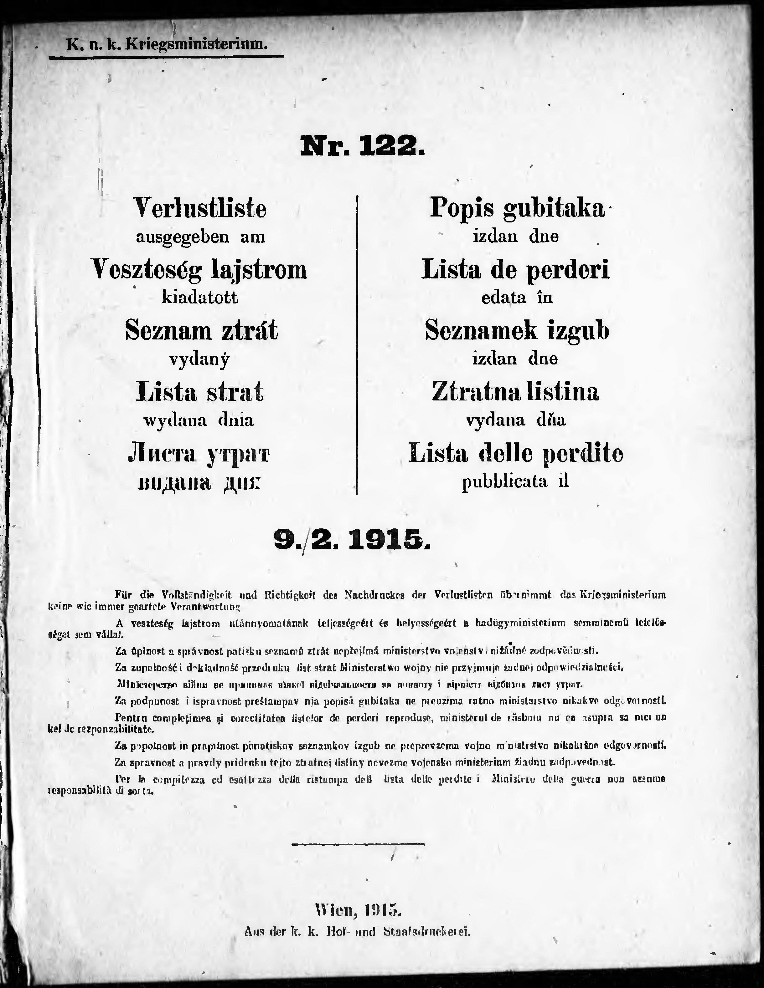 * Datum vydání výtisku: 9.2.1915 Číslo výtisku: 122