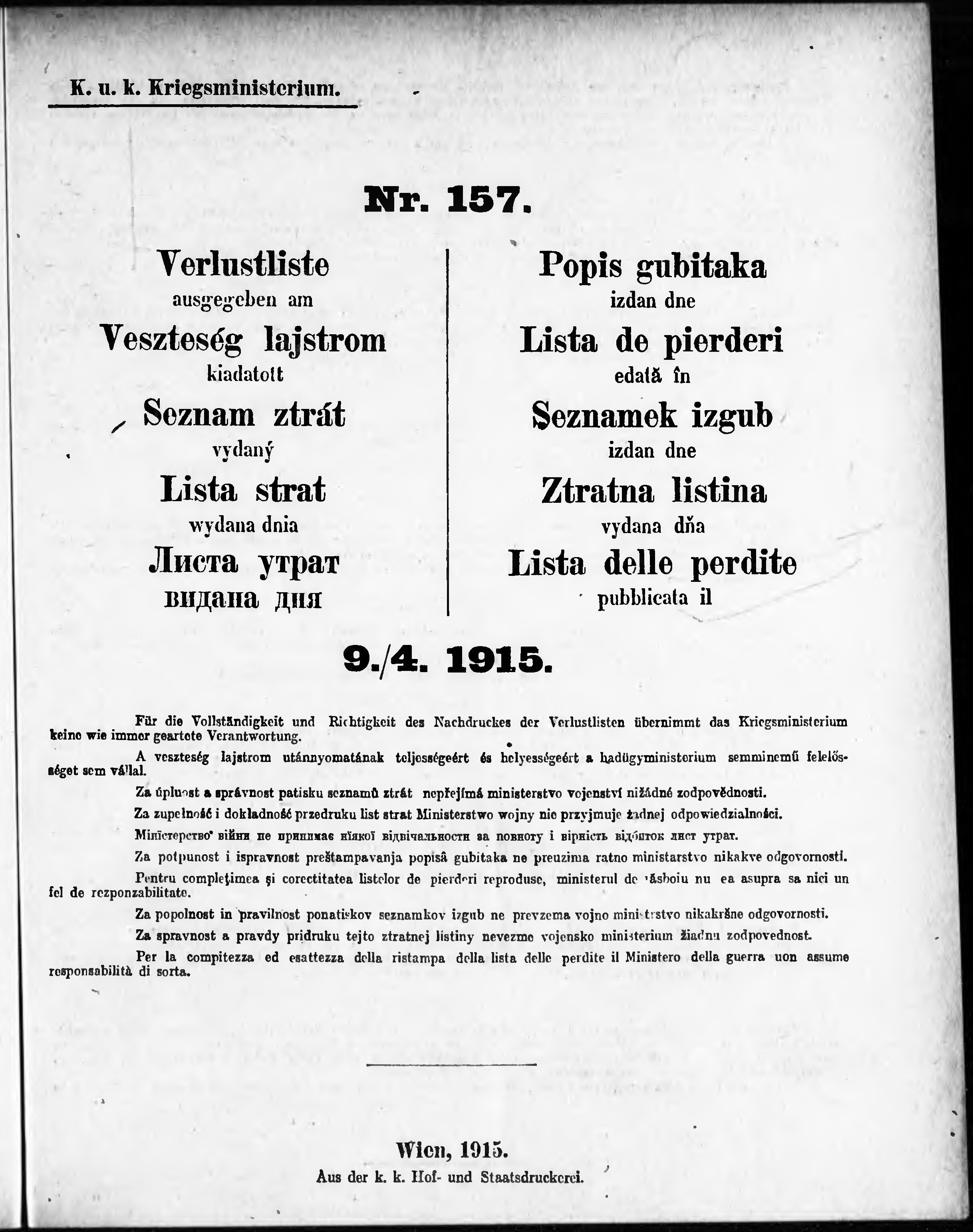 * Datum vydání výtisku: 9.4.1915 Číslo výtisku: 157