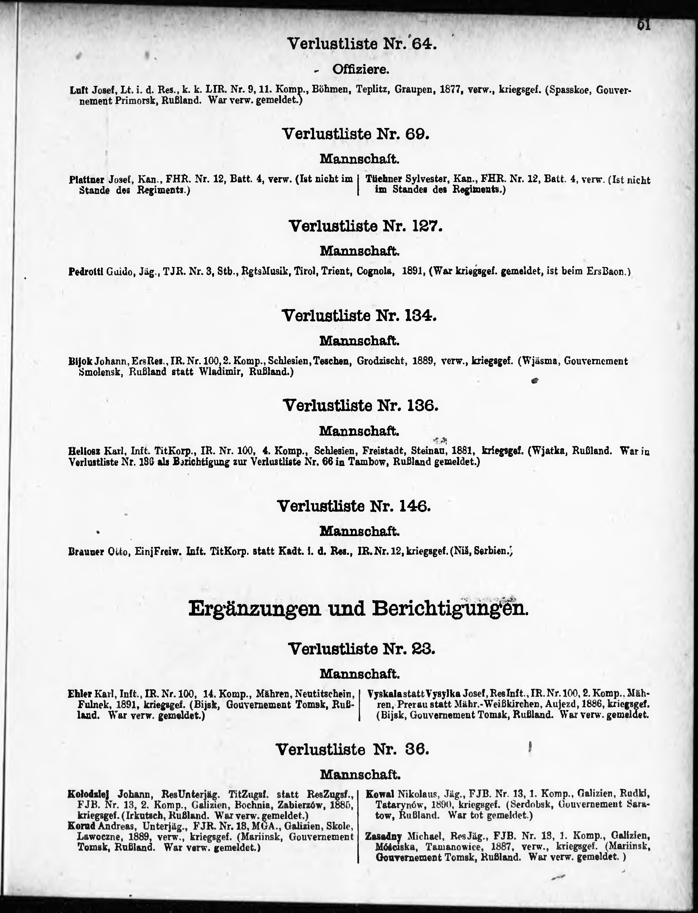 Verlustliste ausgegeben am