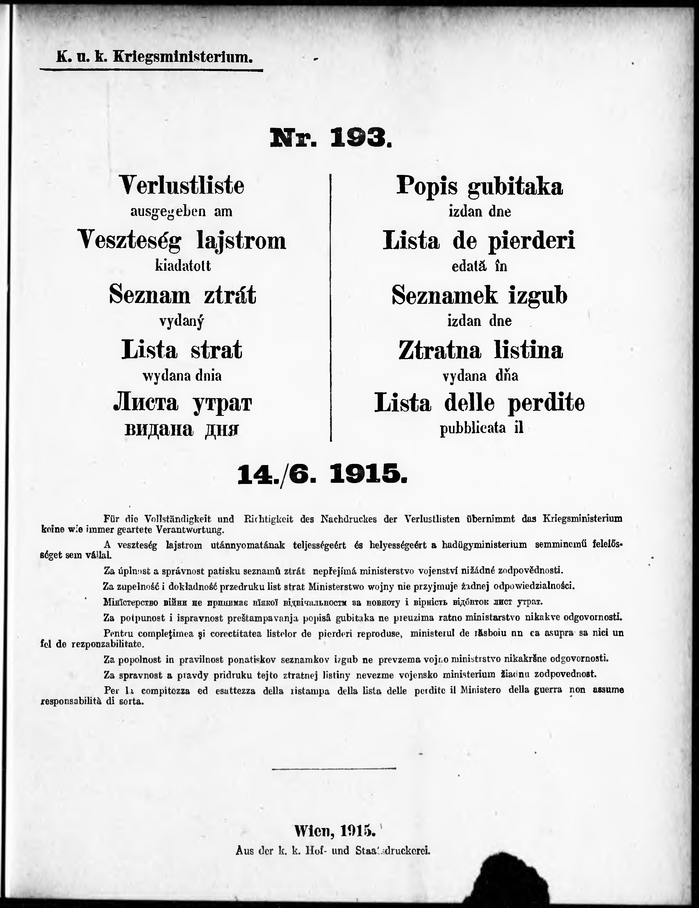 Verlustliste ausgegeben am