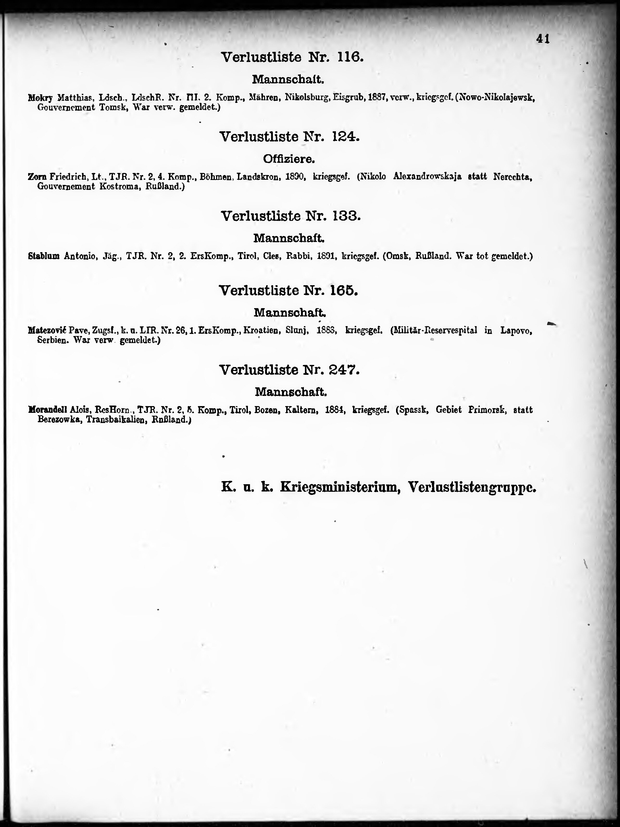 Verlustliste ausgegeben am