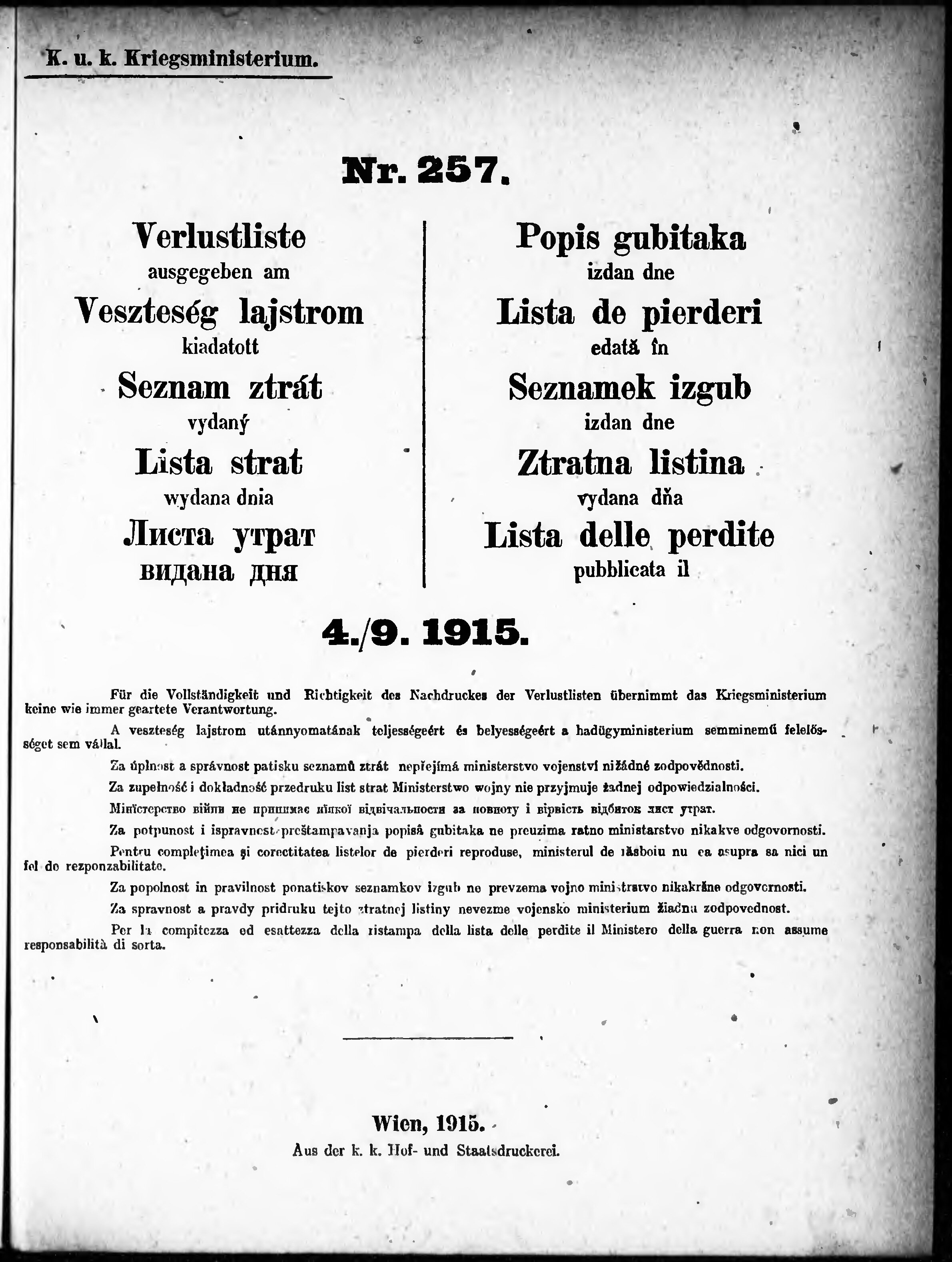* Datum vydání výtisku: 4.9.1915 Číslo výtisku: 257