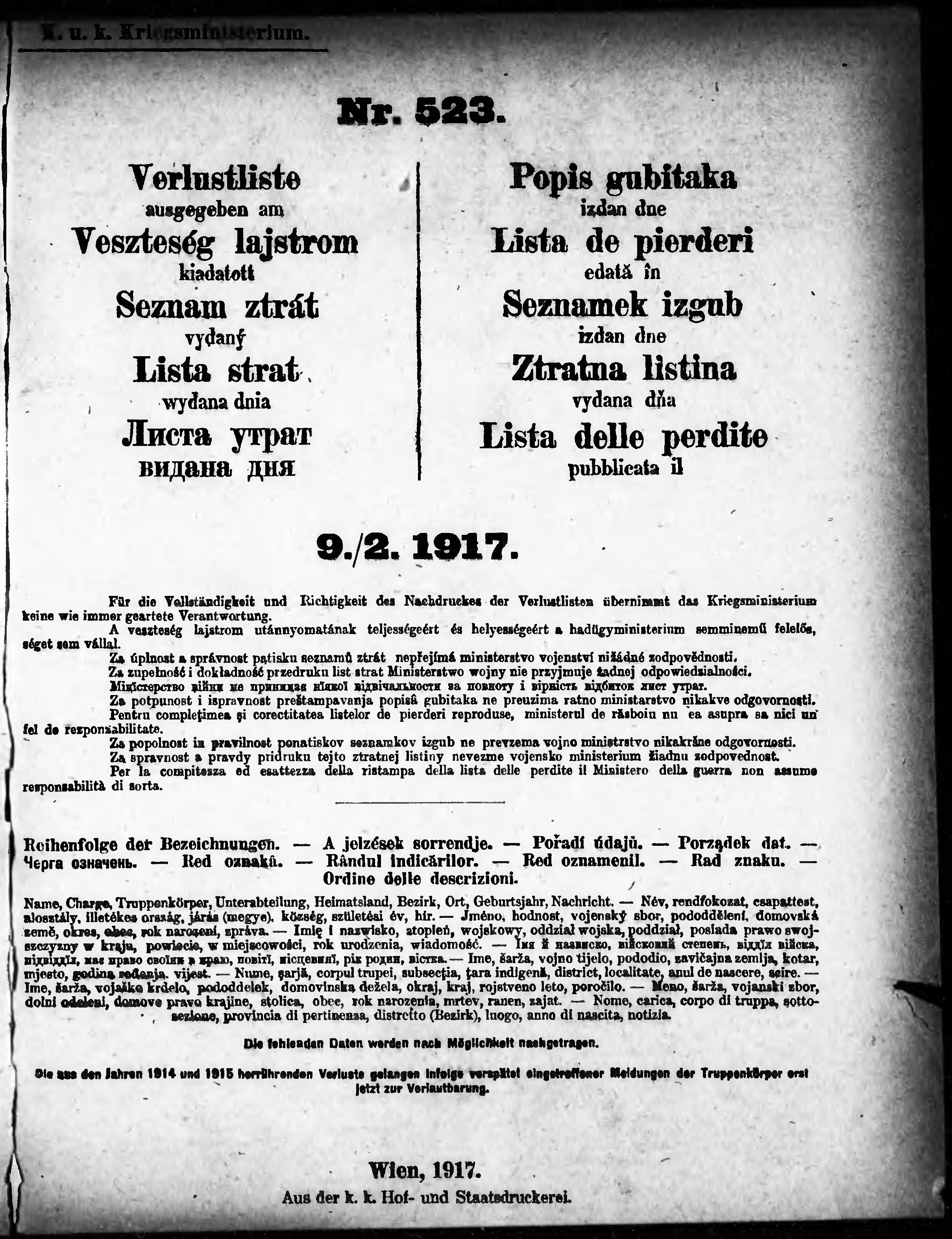 * Datum vydání výtisku: 9.2.1917 Číslo výtisku: 523