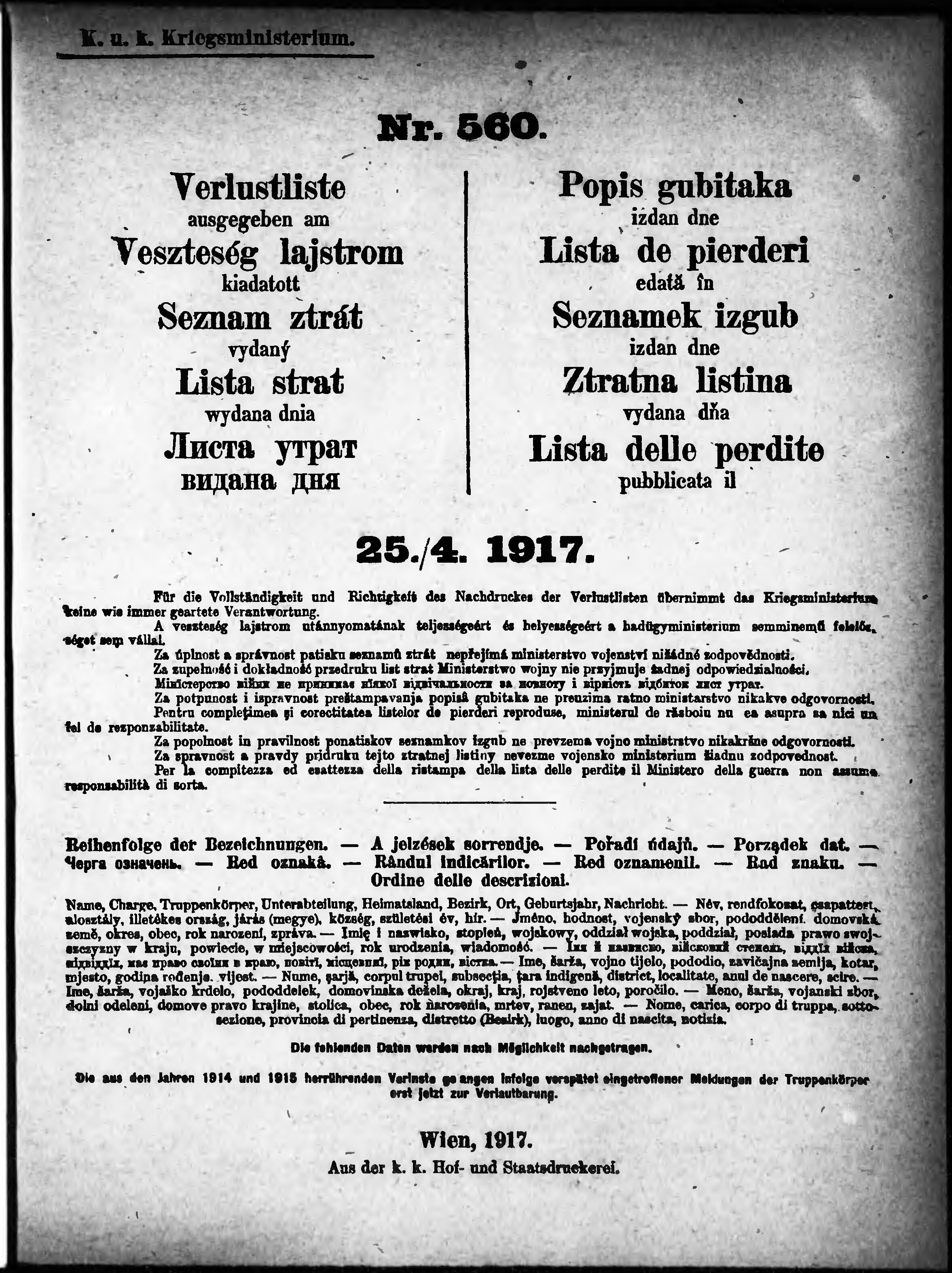 * Datum vydání výtisku: 25.4.1917 Číslo výtisku: 560