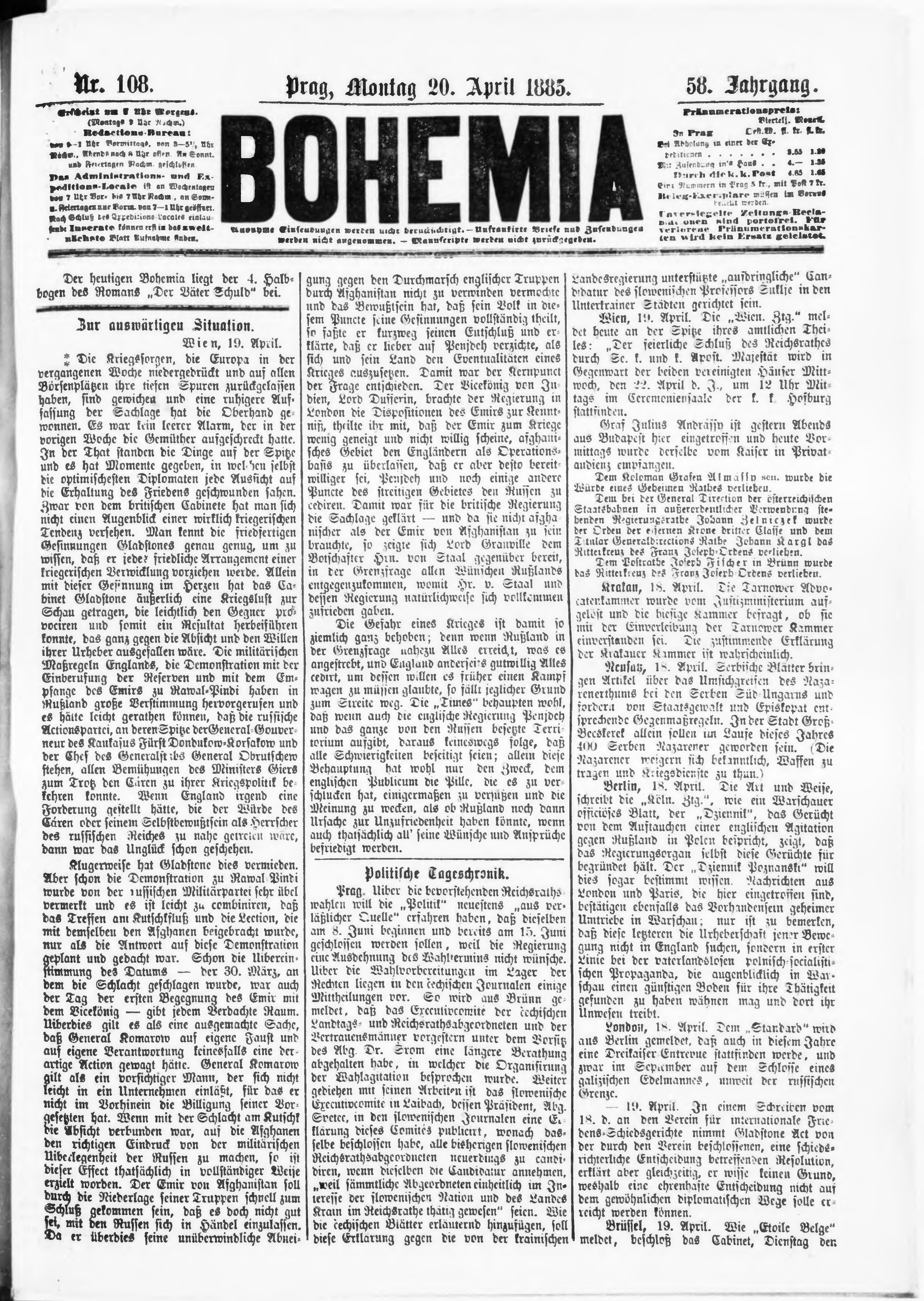 * Datum vydání výtisku: 20.4.1885 Číslo výtisku: 108