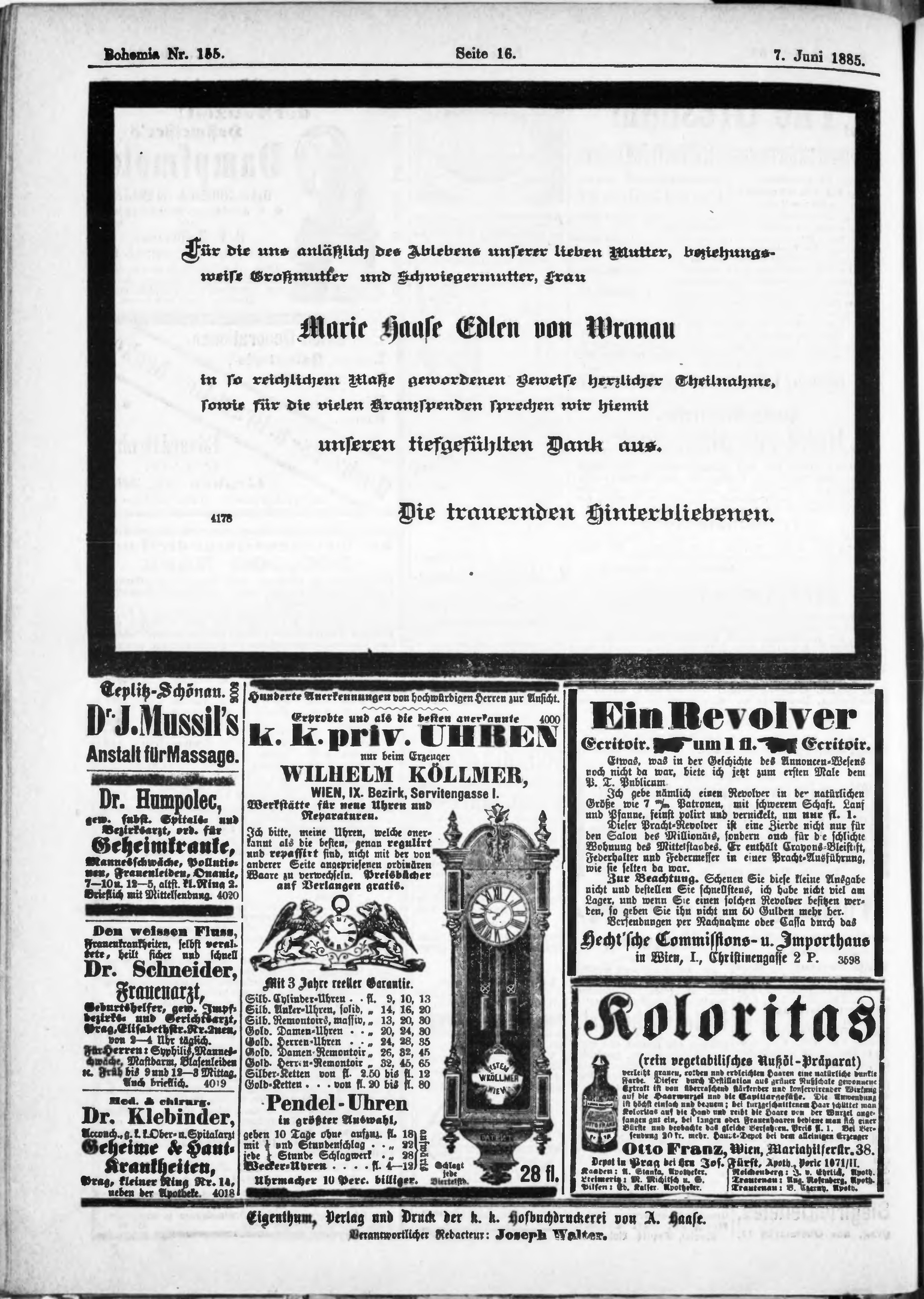 * Datum vydání výtisku: 7.6.1885 Číslo výtisku: 155