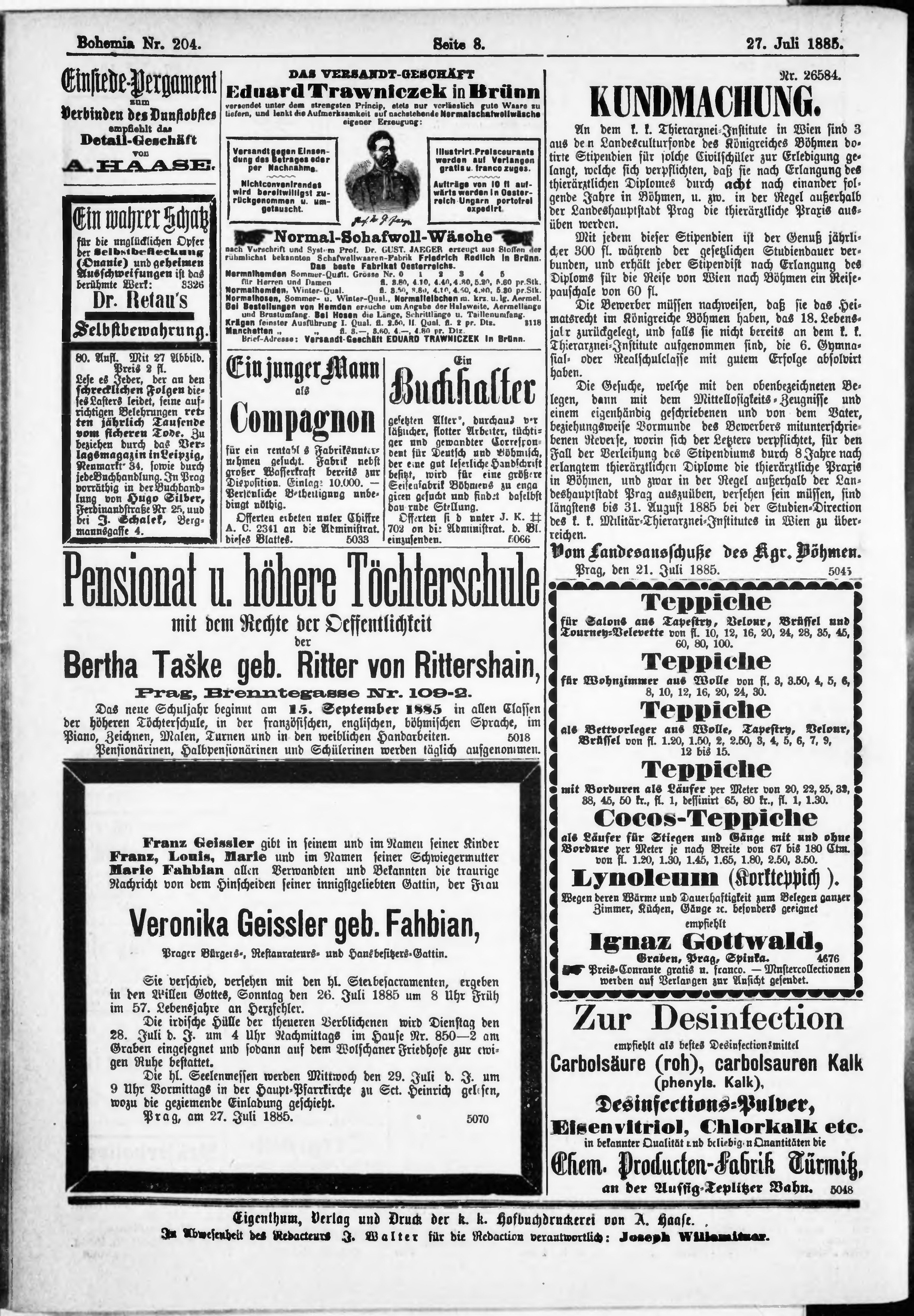 * Datum vydání výtisku: 27.7.1885 Číslo výtisku: 204