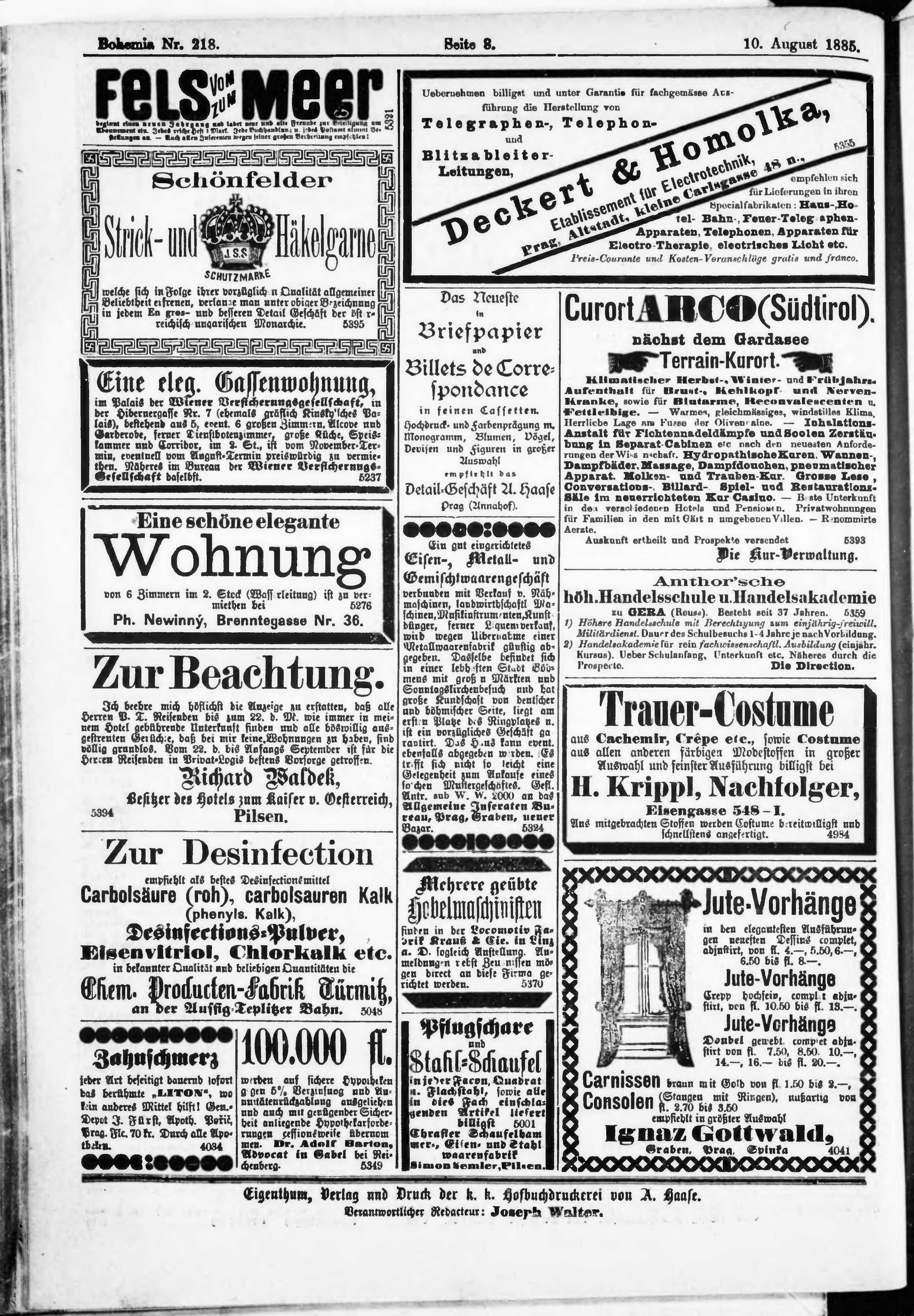* Datum vydání výtisku: 10.8.1885 Číslo výtisku: 218