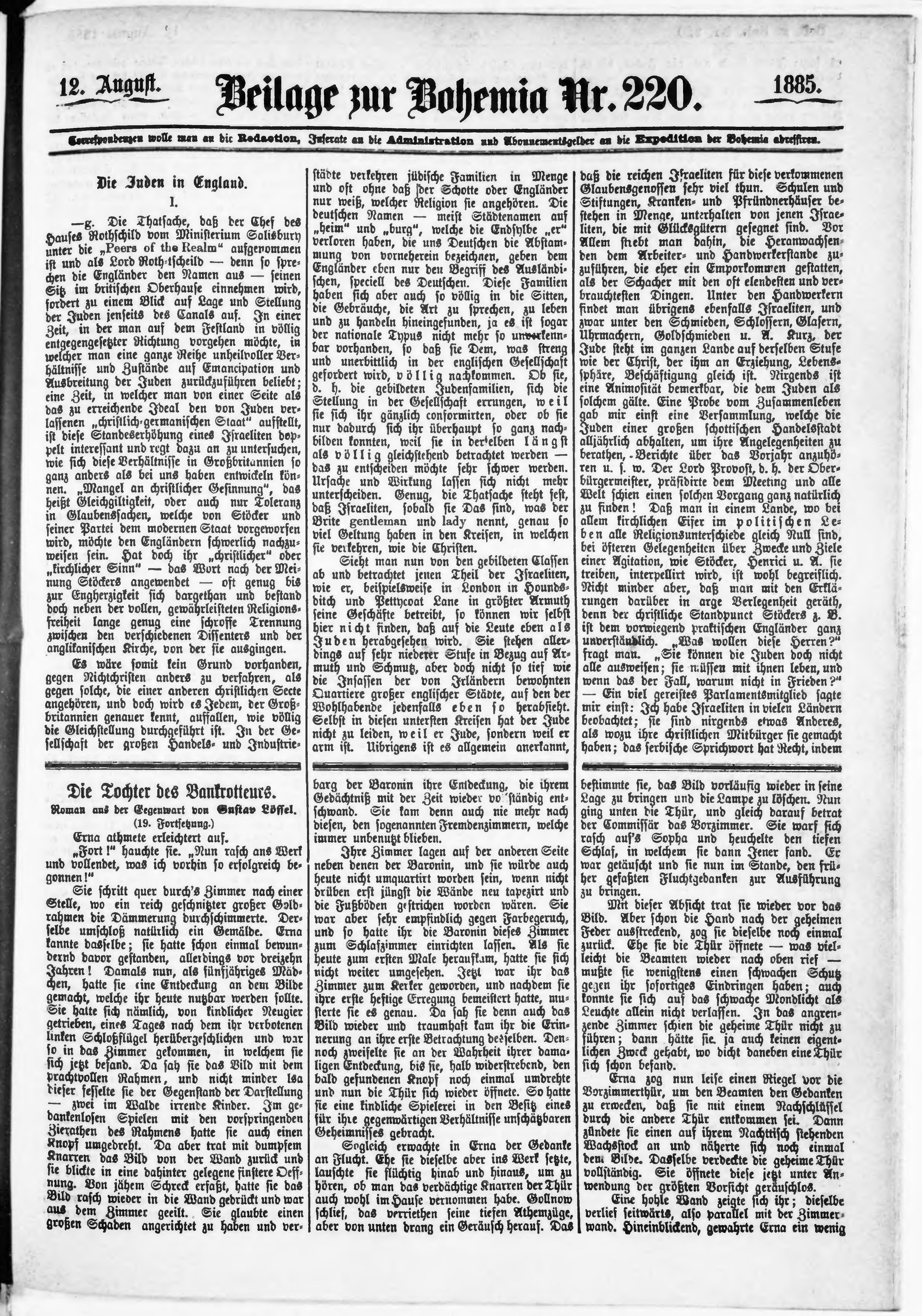 * Datum vydání výtisku: 12.8.1885 Číslo výtisku: 220 Typ výtisku: příloha Poznámky k výtisku: příloha